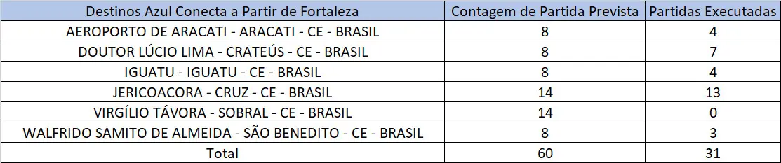 A Secretaria de Turismo do Ceará está atenta aos eventuais cancelamentos de voos da Azul Conecta para destinos regionais cearenses. Em maio, a companhia tinha previsto realizar 60 partidas de Fortaleza, mas realizou apenas 31, pouco mais da metade da previsão, segundo dados da Agência Nacional de Aviação Civil (Anac).