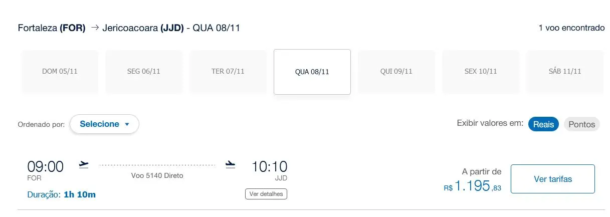 Alguns destinos são vistos com preços elevados, como o principal, Cruz (Jericoacoara). O trecho entre Fortaleza e a famosa praia cearense é oferecido por R$ 1.195, mesmo com um mês de antecedência.