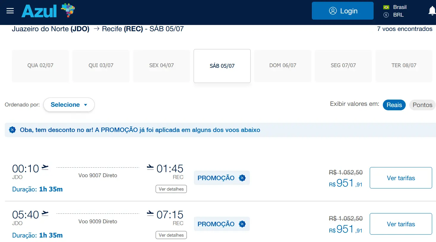 Azul volta a comercializar voos entre Juazeiro do Norte e Recife