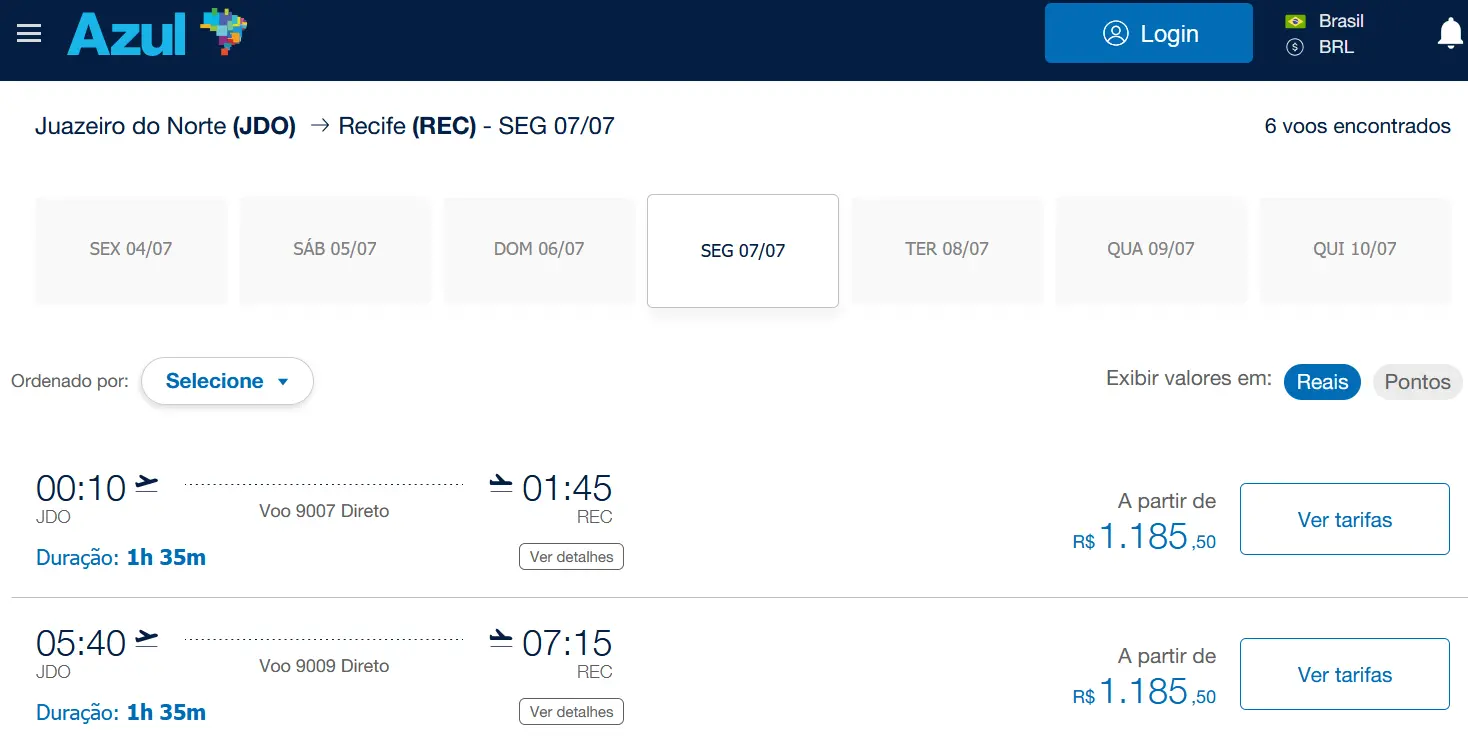 Após julho, os voos retomam em outubro com saídas de Juazeiro do Norte para Recife nos dias 6, 13, 20 e 27/10, também com duas saídas na madrugada. Em novembro, 3, 10, 17, 24 e 29/11.