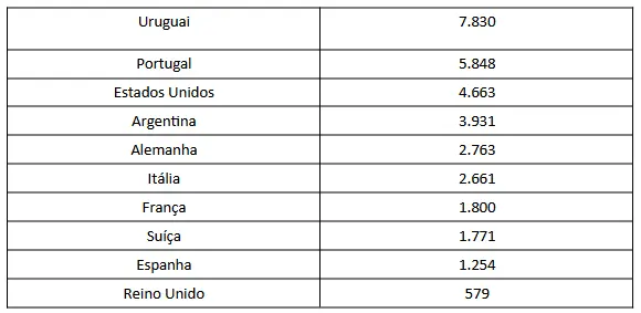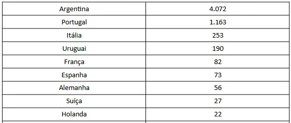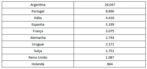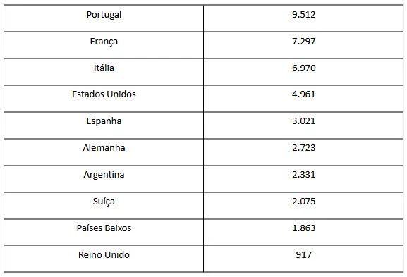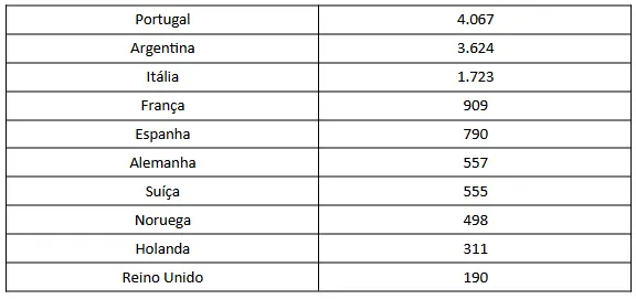 Em seguida, aparecem os franceses (7,2 mil), italianos (6,9 mil) e espanhóis (3,02 mil). Completam a lista Alemanha, Suíça, Países Baixos e Reino Unido.