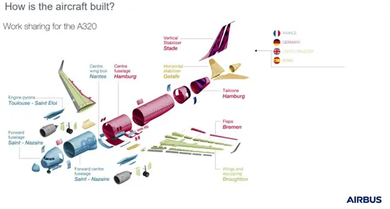 Durante as primeiras explanações, contaram-nos que Toulouse era a linha de montagem final das famílias de aeronaves comerciais. As partes dessas aeronaves, porém, são fabricadas em diferentes países da Europa: Alemanha, Espanha, Reino Unido, França, dentre algumas cidades, conforme arte abaixo.