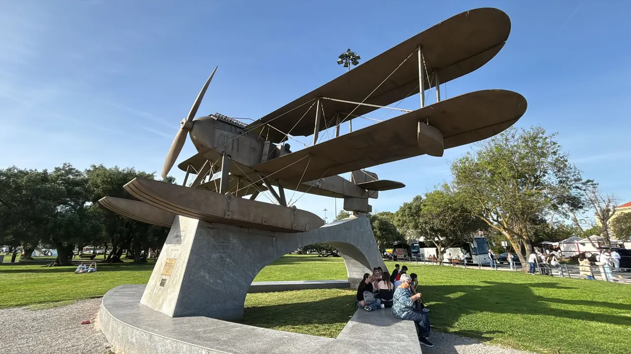 Na capital portuguesa, achei um monumento da primeira travessia do Atlântico Sul que fica localizado no Jardim da Torre de Belém e é uma reprodução em aço inox do hidroavião Fairey F III-D, chamado de Lusitânia.