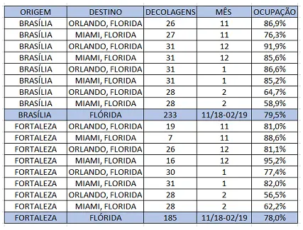 A Gol Linhas Aéreas tem mantido voos entre Brasília e a Flórida com média mensal de 6 partidas semanais divididas para Miami e para Orlando. A ocupação média de ida é 84,2%.