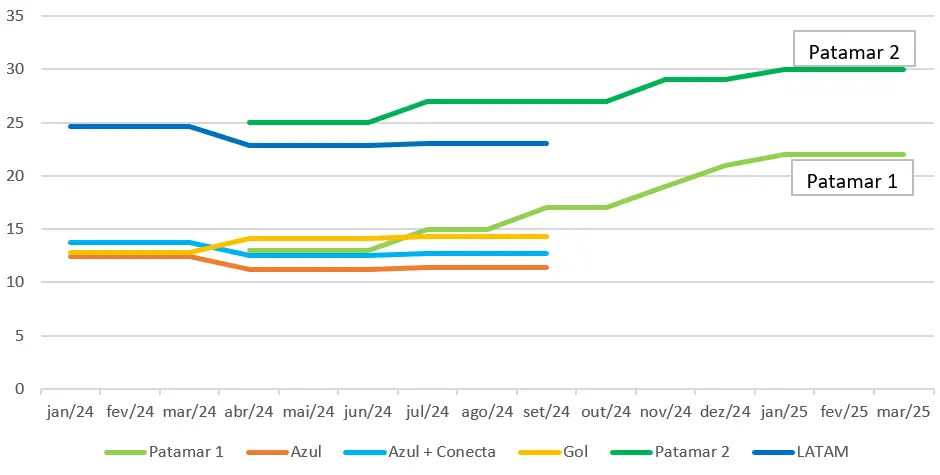 A quantidade de voos mínimos para cada patamar, conforme mês e ano segue abaixo: