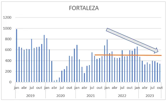 O resultado imediato é que já em janeiro de 2023, tivemos a pior alta estação de Fortaleza desde janeiro de 2013 (descontado jan/2021, período agudo de pandemia).