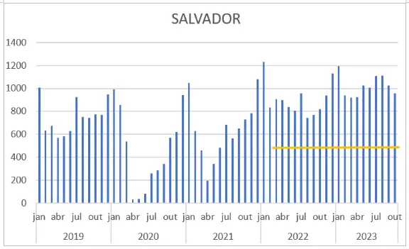 As operações de passageiros em Salvador em janeiro de 2023 foram menores que em janeiro de 2022, respectivamente 680.807 e 694.284 passageiros de todas as companhias aéreas.