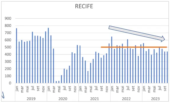 Como resultado, a base Gol de Recife (assim como Fortaleza) também será impactada (aparentemente) com o fortalecimento de Salvador, vindo a ter mínimos relevantes de operação também previstos para 2023.