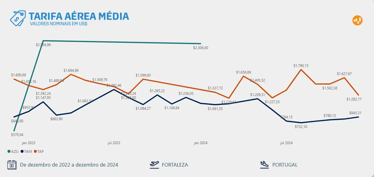 Segundo o sistema de tarifas de passagens da Agência Nacional de Aviação Civil (Anac), a Latam já era a companhia com melhores preços de classe econômica entre Fortaleza e Portugal, considerando voos diretos ou não.