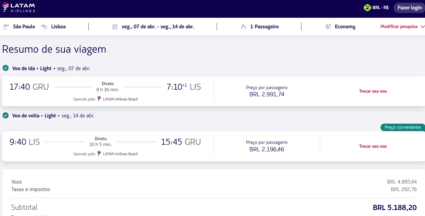 Como comparação, o voo mais barato entre Guarulhos e Lisboa entre 7 e 14 de abril sai por R$ 5188,20.