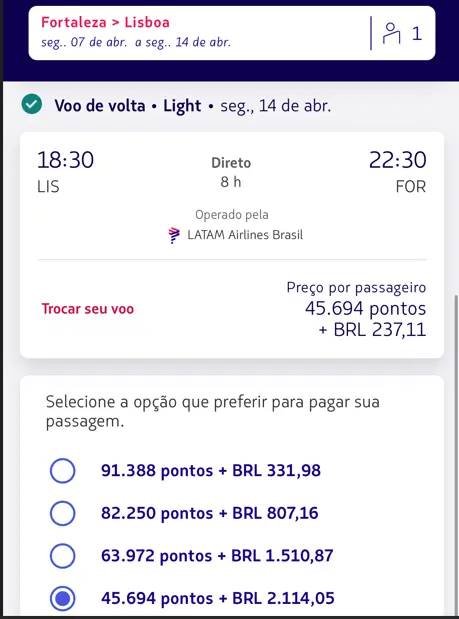 A Latam permite combinar milhas e dinheiro, reduzindo ainda mais o valor em dinheiro. Um voo ida e volta combinando dinheiro e milhas sai por R$ 2.114,05 e mais 45.694 pontos do Latam Pass, super condição.