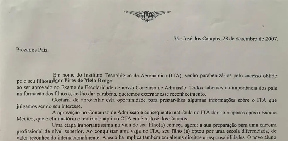 Quando passei, era dezembro de 2007, o ITA enviou um conjunto grande de correspondências pelo correio. Eram textos, cartilhas com fotos, instruções de como seria a vida dali em diante, inclusive uma carta de agradecimento aos pais.