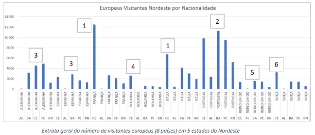 - Grande predileção dos franceses e italianos pelo Ceará com mais de 12 mil e 6,5 mil franceses e italianos, respectivamente, recebidos. Interessante chamar atenção que mesmo sem voos diretos da Itália para o Nordeste, os italianos se fazem presentes em bons números.