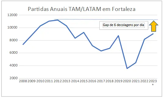 A Latam ainda precisaria implementar mais seis decolagens por dia (média) para atingir os excelentes números que tinha em Fortaleza em 2012 (máximo histórico).