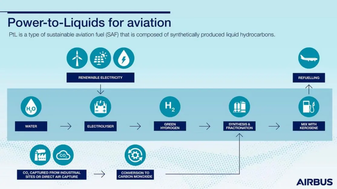 No processo conhecido como “power-to-liquids”, o querosene SAF é liquefeito e pode se misturar ao querosene convencional (formando um blend) com características sustentáveis.