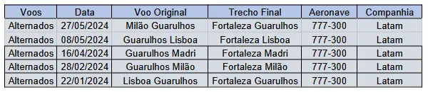 A tabela abaixo demonstra uma série de voos internacionais da Latam que tiveram ocorrências, de mais variados tipos, em voos e precisaram se desviar para Fortaleza. Após a equalização das dificuldades, os voos partiam de Fortaleza para serem finalizados.