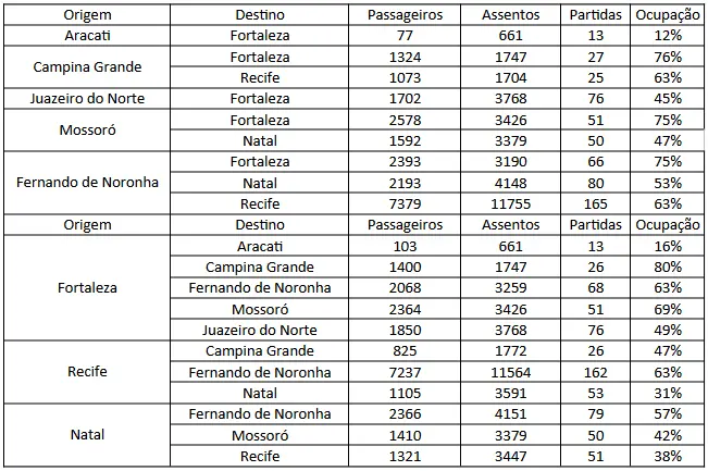 Ligações entre Recife e Noronha mostraram a força da ligação intra pernambucana. Foram mais de 14,5 mil passageiros, com média próxima a duas saídas por dia de cada aeroporto. Nas ligações intra-Ceará, entretanto, resultados fracos: Fortaleza-Aracati, com ligações semanais, continuam com resultados muito ruins, menos de 20% de ocupação.