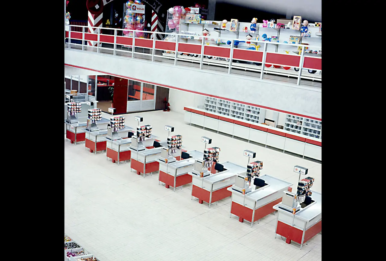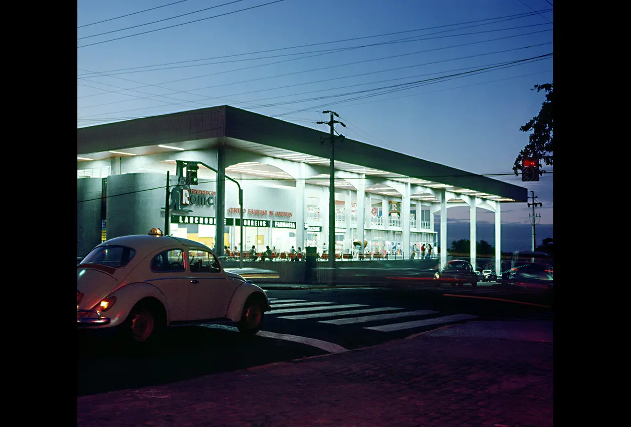 Caracterizado como um "centro familiar de compras", é possível notar que a fachada abriga dizeres como "lanchonete", "correios" e "farmácia", indicando a variedade de produtos e serviços que era possível encontrar no local.