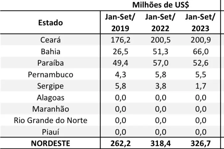 O Ceará é o maior emissor de calçados do Nordeste para o mercado externo. Em segundo lugar está a Bahia, com US$ 66 milhões exportados. As posições seguintes são ocupadas por Paraíba, Pernambuco e Sergipe. Alagoas, Maranhão, Rio Grande do Norte e Piauí não exportam o produto, conforme relatório da Abicalçados.