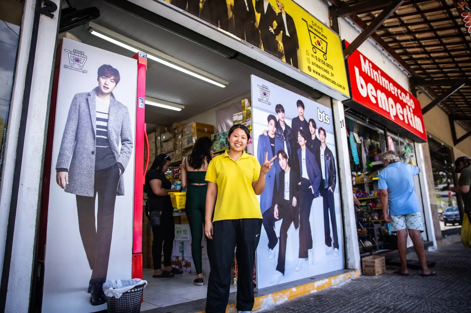 Do outro lado do muro, no mesmo pátio comercial, outra loja chama a atenção: fachada amarela, palavras no alfabeto coreano e um grande pôster da boyband sul-coreana BTS, fenômeno mundial que caiu no gosto do brasileiro. Se trata do Uri Mercado Coreano, que chegou ao Ceará quando a cultura asiática no Nordeste ainda se limitava a China e Japão, lembra a coreana Elisa Lee, proprietária do empreendimento. “A nossa relação com os vizinhos é muito boa. Eles me dão cuscuz”, diz, sorrindo.
