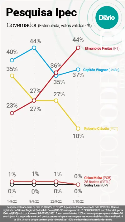 Em quatro rodadas, todas no mês de setembro, Elmano de Freitas saiu da terceira posição e chegou ao último dia de campanha liderando nas intenções de voto, considerando os votos válidos, quando são excluídos brancos, nulos e indecisos. Nesse caso, é considerada, para a base de cálculo do percentual, somente os votos atribuídos aos candidatos.
