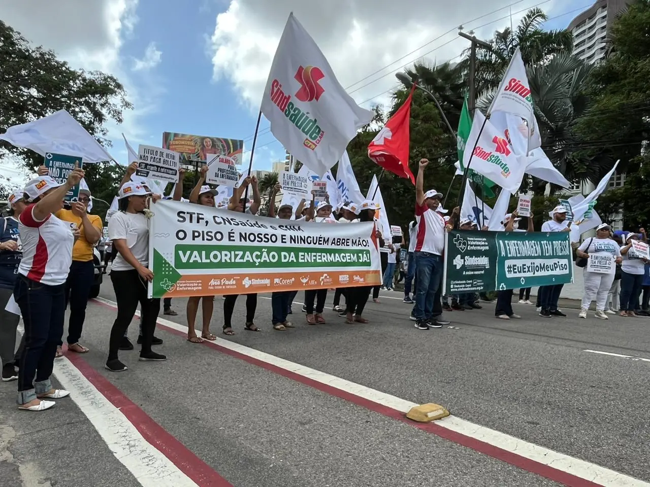 Um grupo de enfermeiros, técnicos e auxiliares de enfermagem e parteiras protestou nesta quarta-feira (4) contra a manutenção da liminar no Supremo Tribunal Federal (STF) que suspende o pagamento do piso salarial da enfermagem. O ato aconteceu em frente ao prédio do Tribunal Regional do Trabalho (TRT), em Fortaleza.