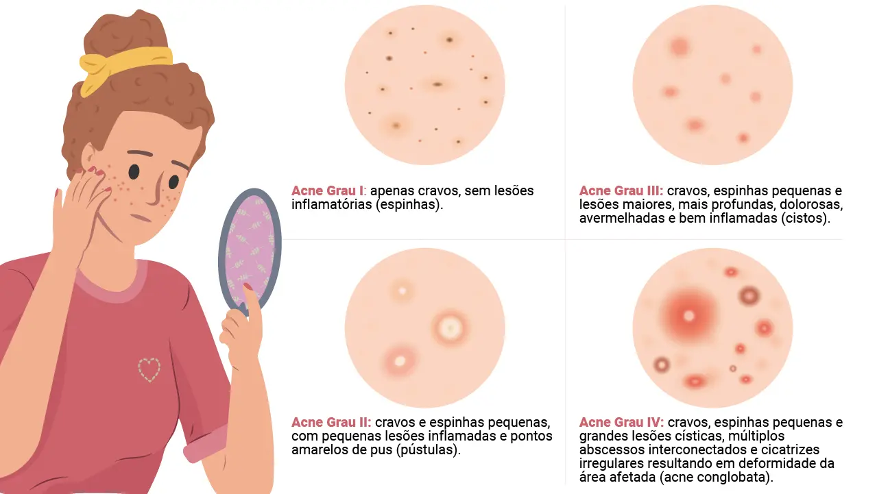A acne, por si só, pode se apresentar por diferentes tipos de lesões. Além disso, essa condição tem uma classificação conforme o grau de inflamação, indo de grau um a quatro. O último é o mais grave com cravos, espinhas, lesões císticas, abcessos.