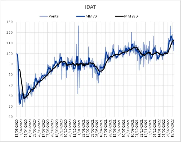 Partindo de uma base 100, o IDAT retratou um mergulho inicial na atividade econômica, acompanhando o colapso da mobilidade social, na segunda quinzena de março de 2020 – o indicador atingiu seu mínimo mensal em abril, 40% abaixo do patamar pré-pandemia.