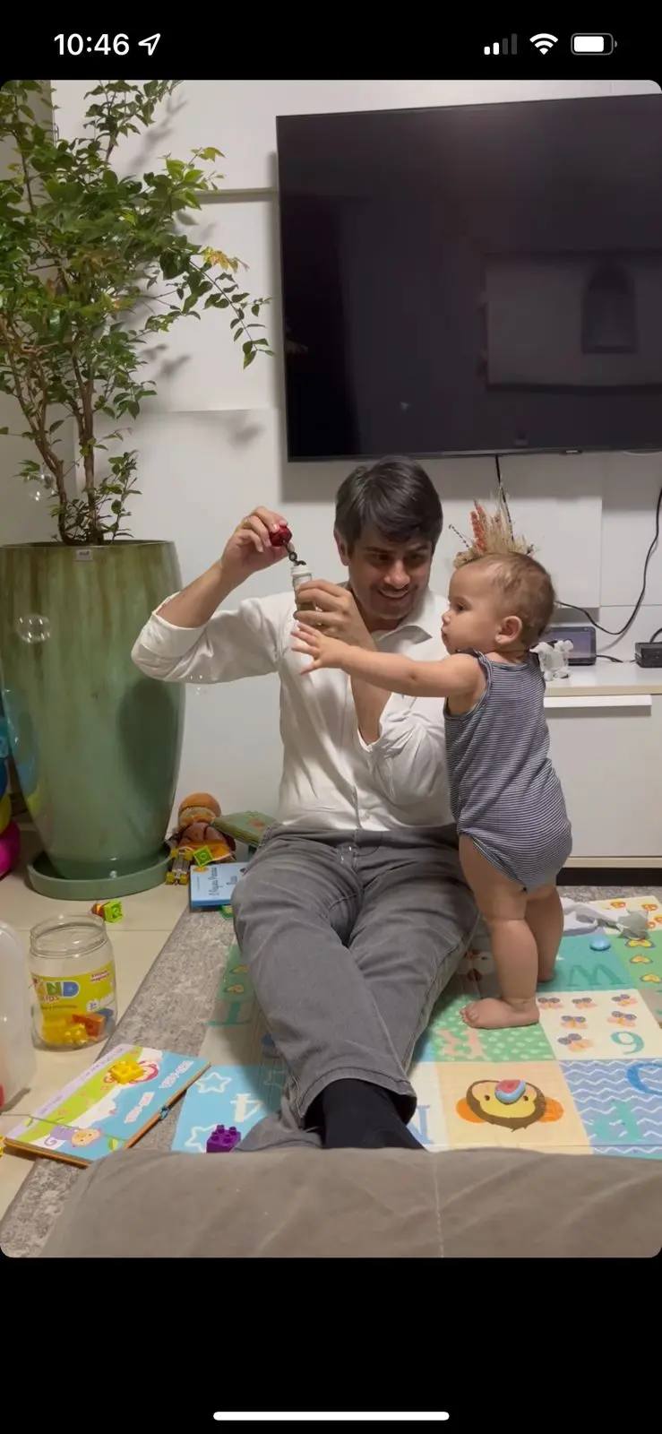 Hoje quando ele chegou do trabalho, pediu alguma coisa pra comer, falou com nossa cachorra e ficou fazendo bolinhas de sabão com nossa filha.