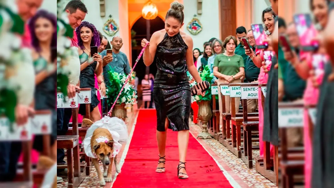 No último fim de semana, os cães viraram pajens e entraram na igreja levando as alianças, que estavam em uma almofadinha pendurada no pescoço de Pipoca, que usava vestido.
