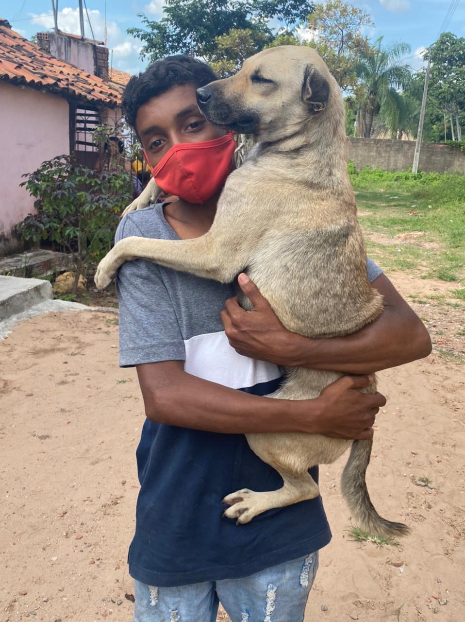 O garoto José Carlos Pereira aparece pedalando pela cidade do Crato com a cadela Costelinha nos braços. O vídeo viralizou. "Essa coitada vive atrás de mim. Aí eu carrego para nenhum carro bater nela e ela não se machucar", explica.
