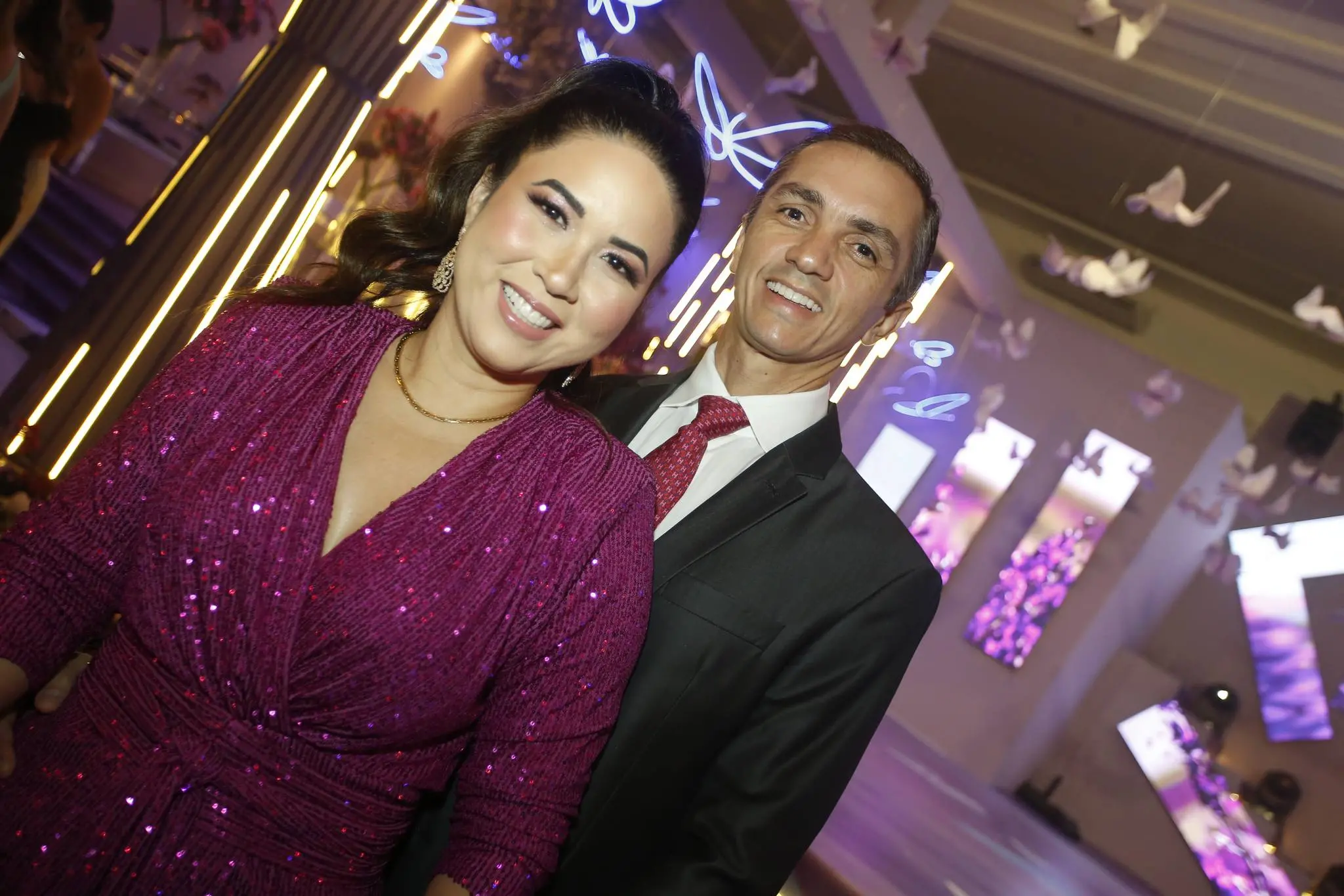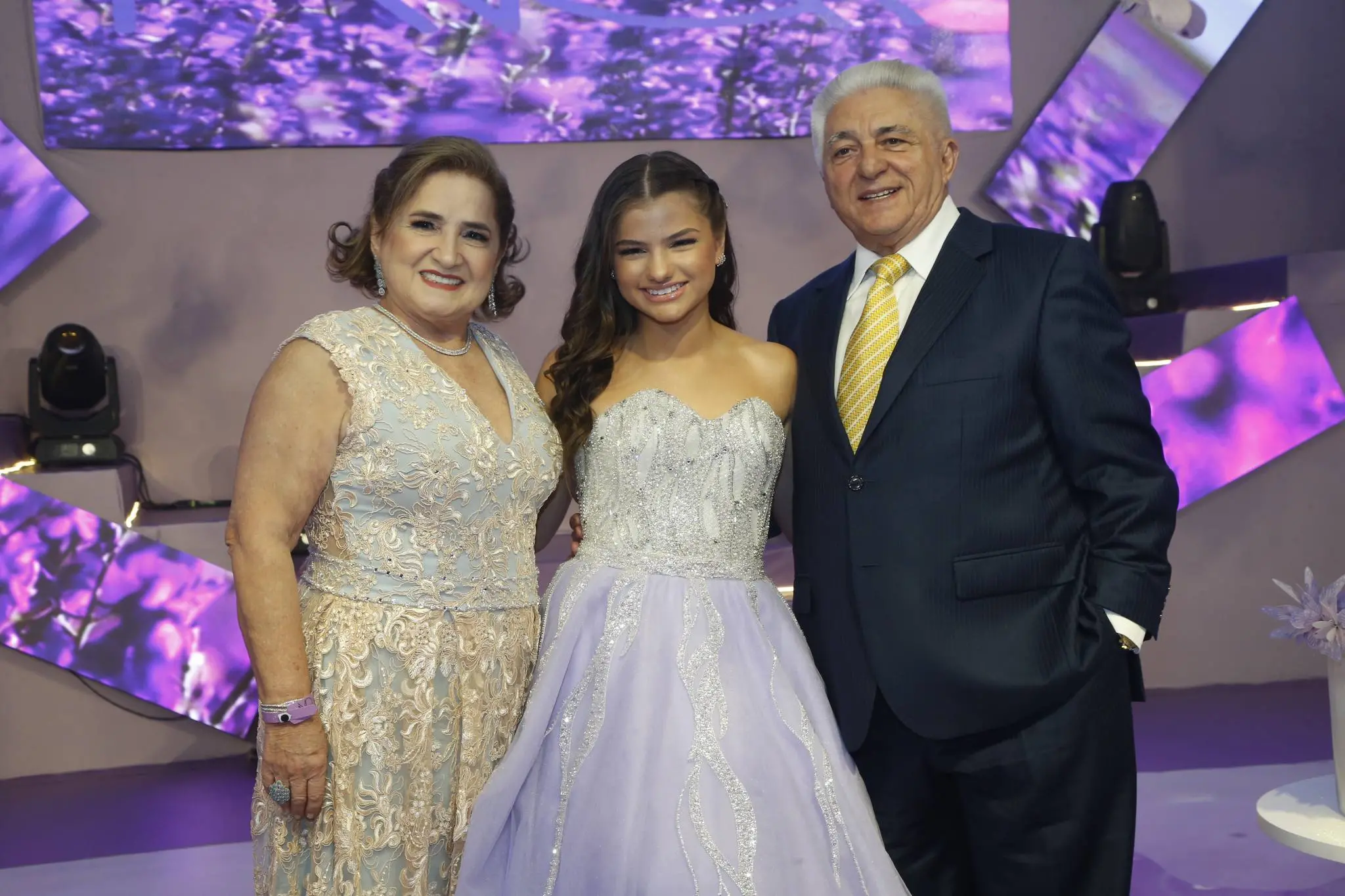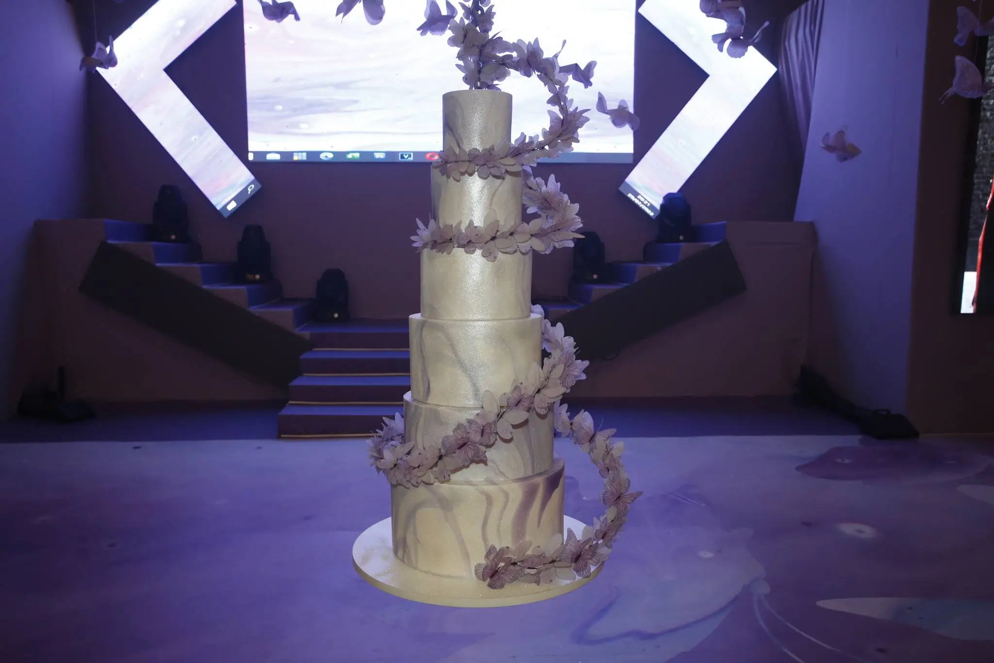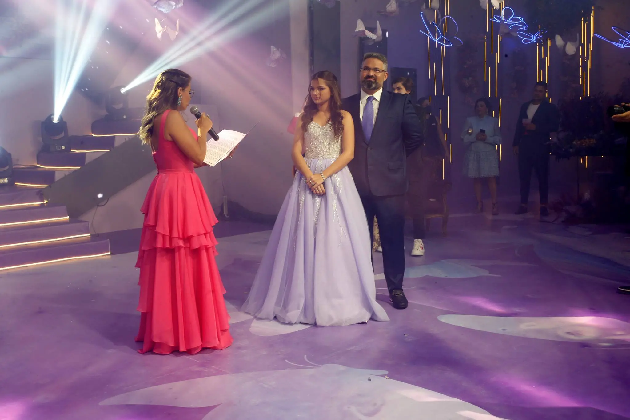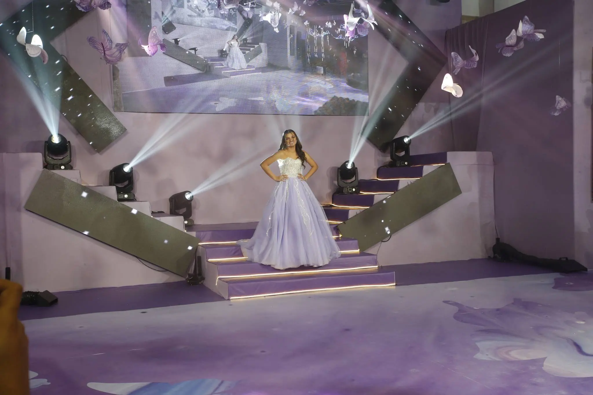 Gil Santos levou para o espaço um cenário em tonalidade lilás. Um jardim de borboletas, entre painéis de led variando lindas fotos da aniversariante. O bolo suspenso com vários andares foi uma atração à parte.