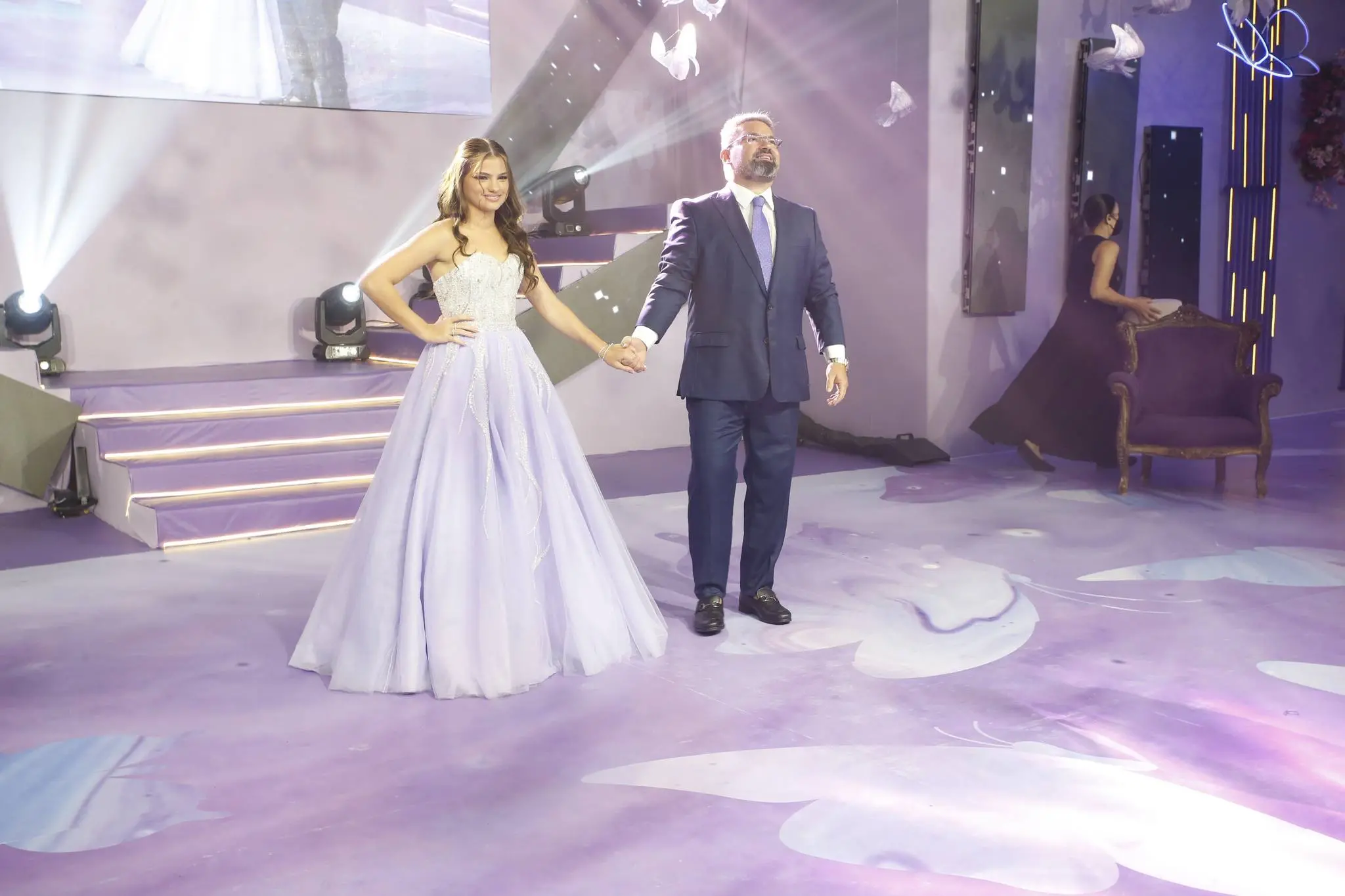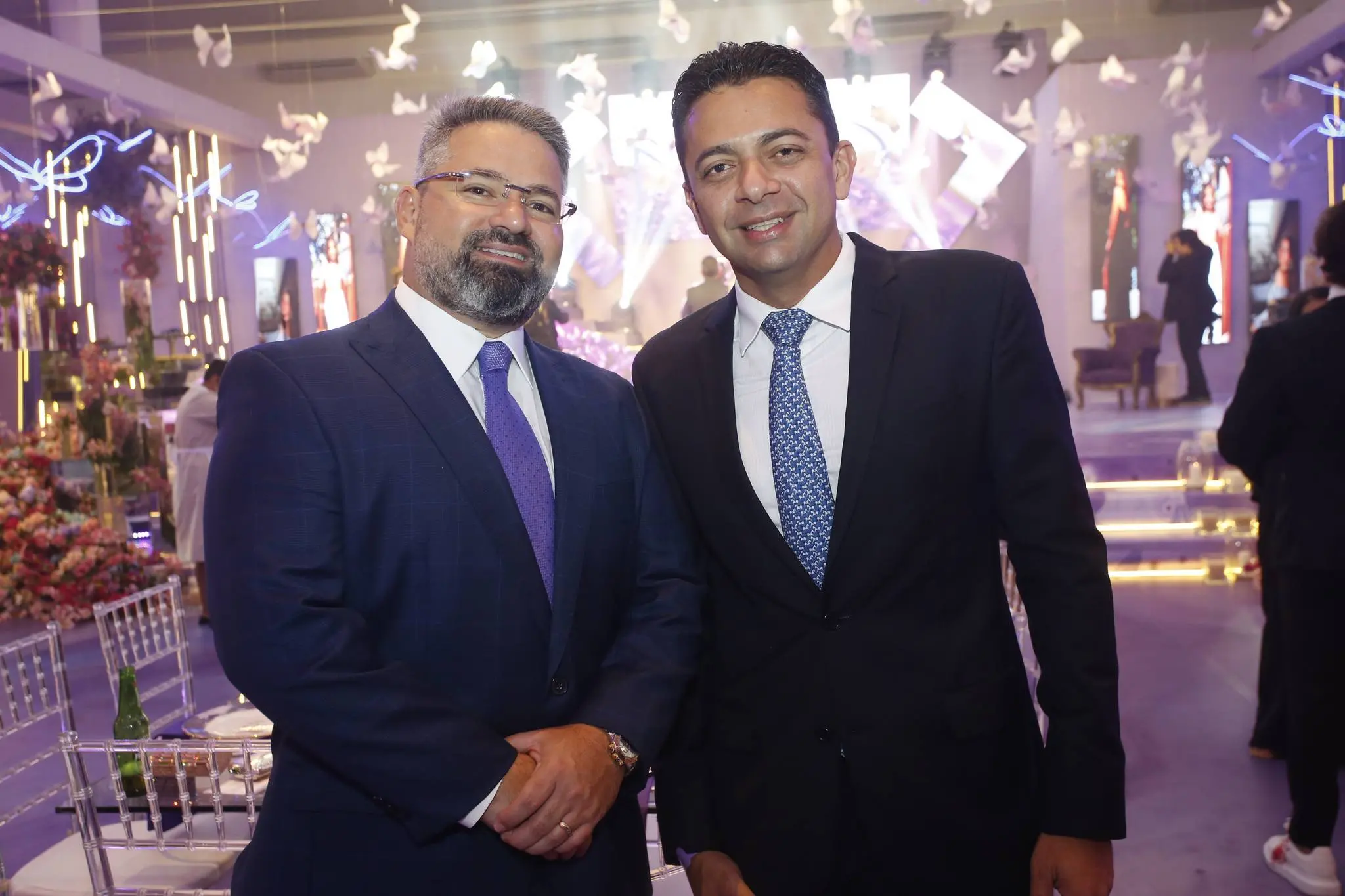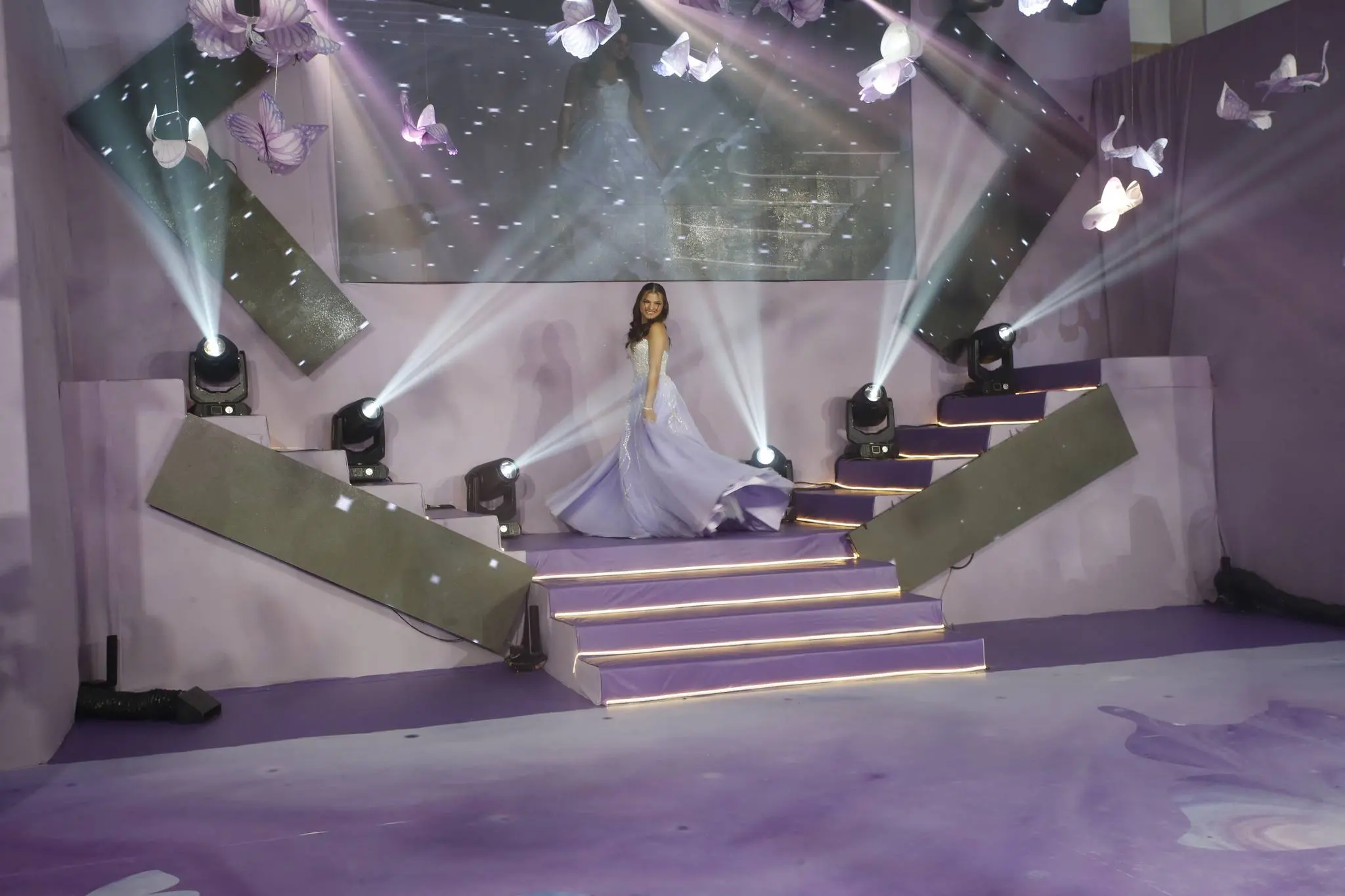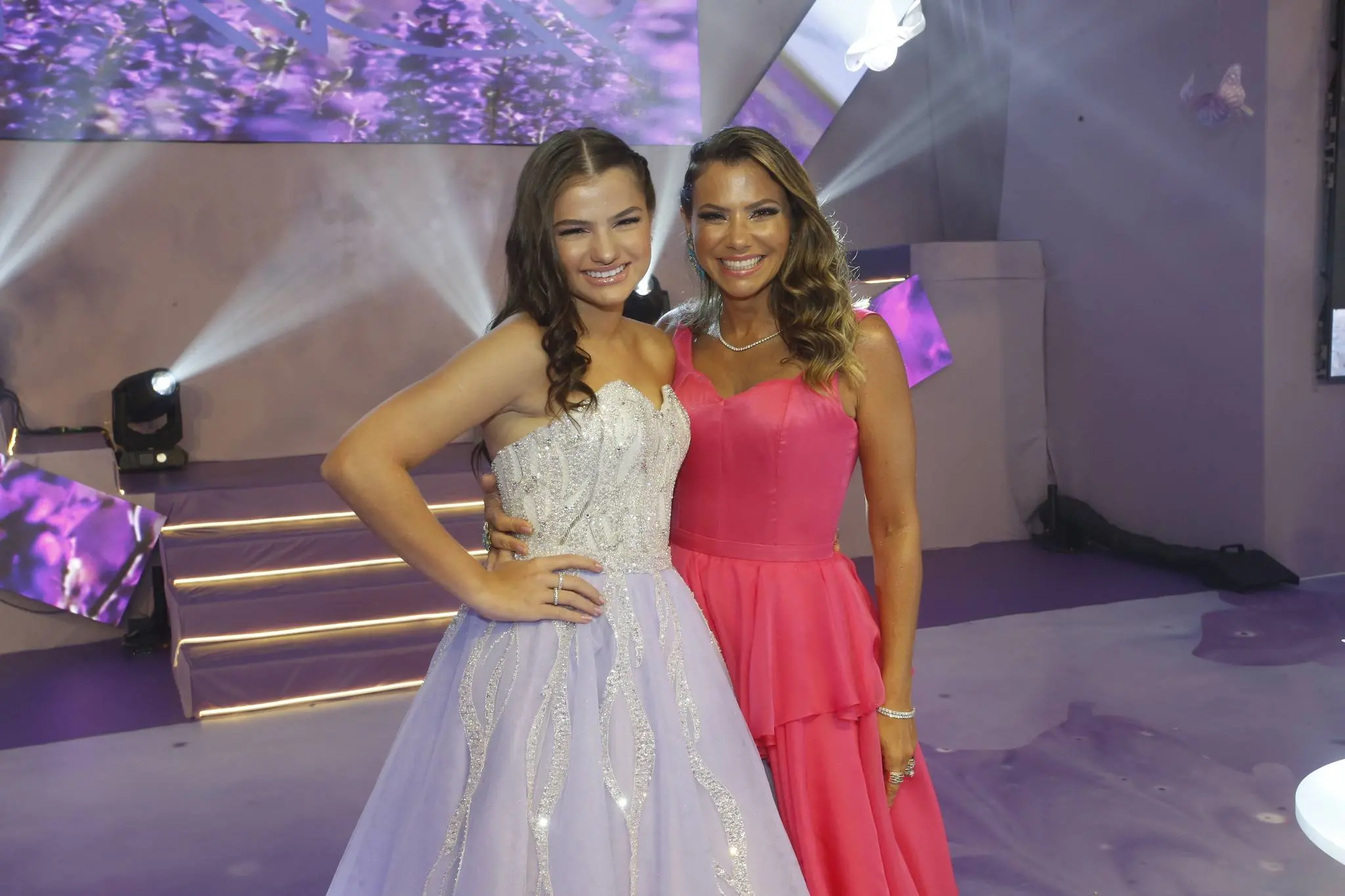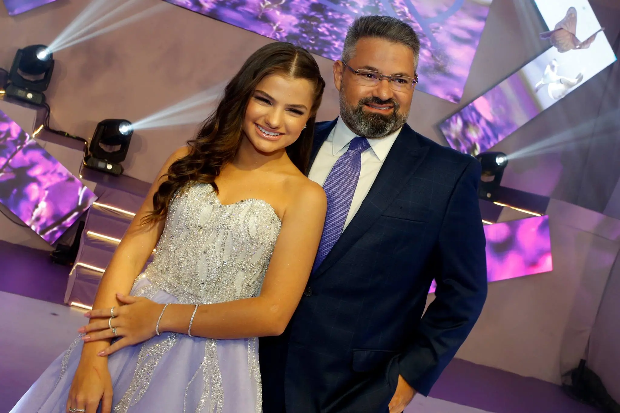 Gil Santos levou para o espaço um cenário em tonalidade lilás. Um jardim de borboletas, entre painéis de led variando lindas fotos da aniversariante. O bolo suspenso com vários andares foi uma atração à parte.
