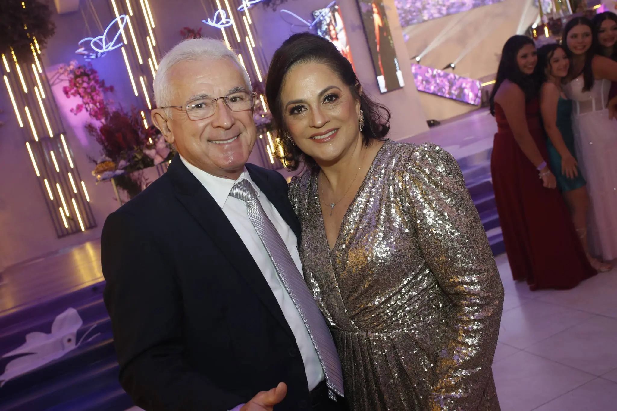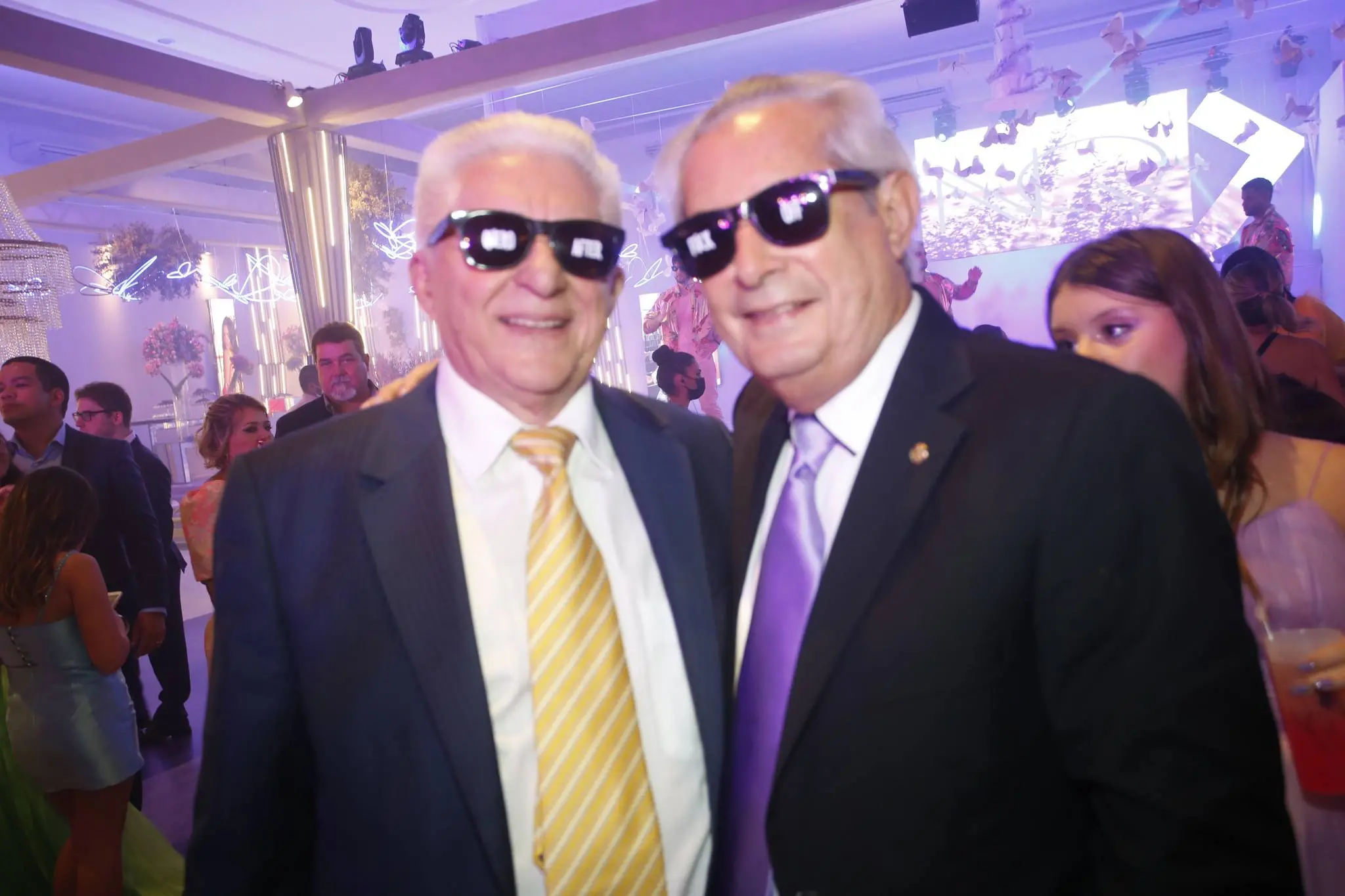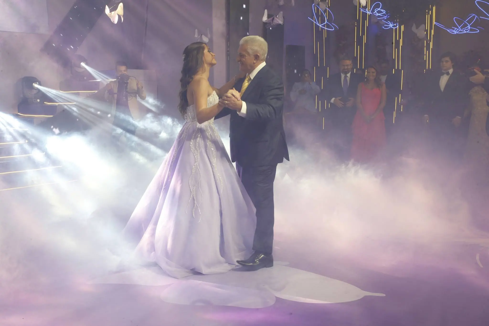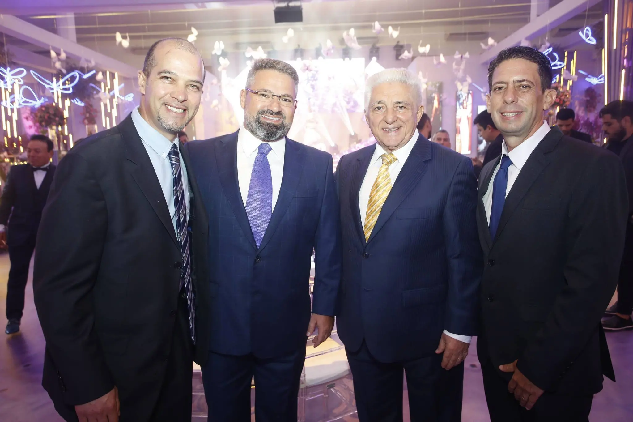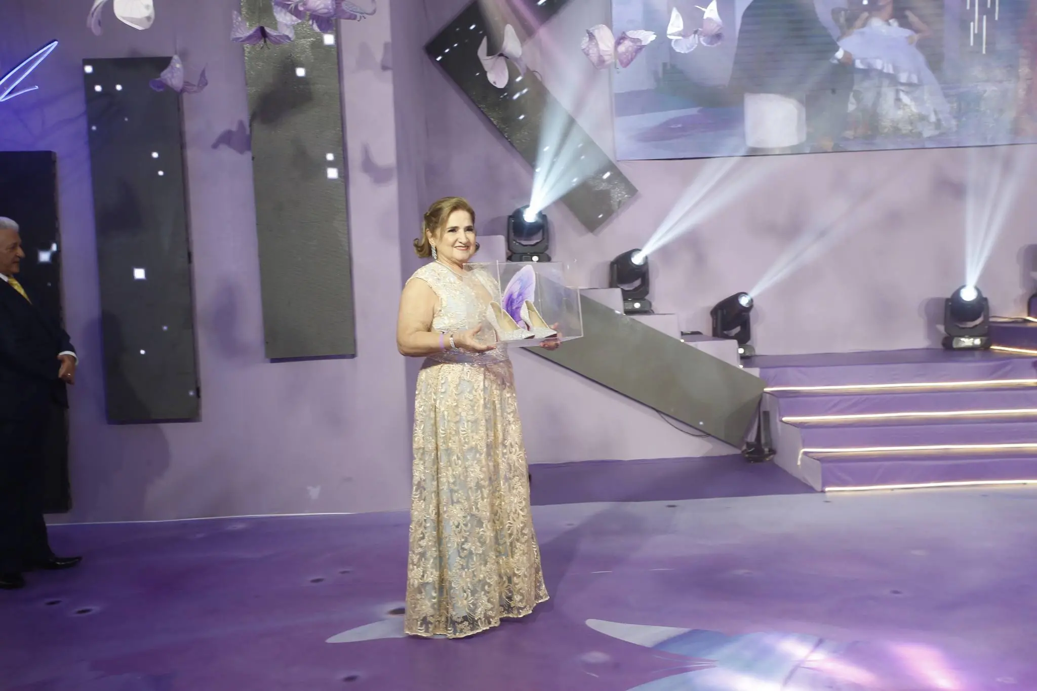 Gil Santos levou para o espaço um cenário em tonalidade lilás. Um jardim de borboletas, entre painéis de led variando lindas fotos da aniversariante. O bolo suspenso com vários andares foi uma atração à parte.