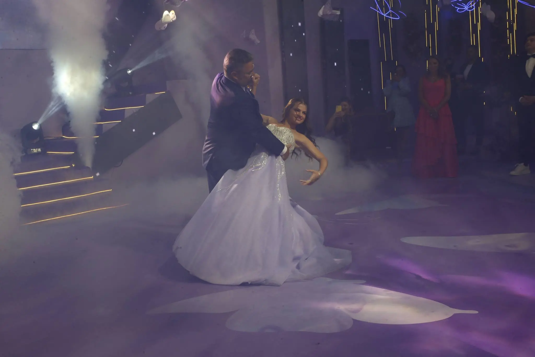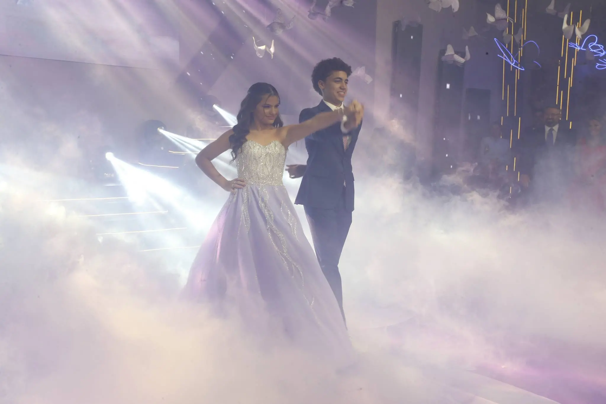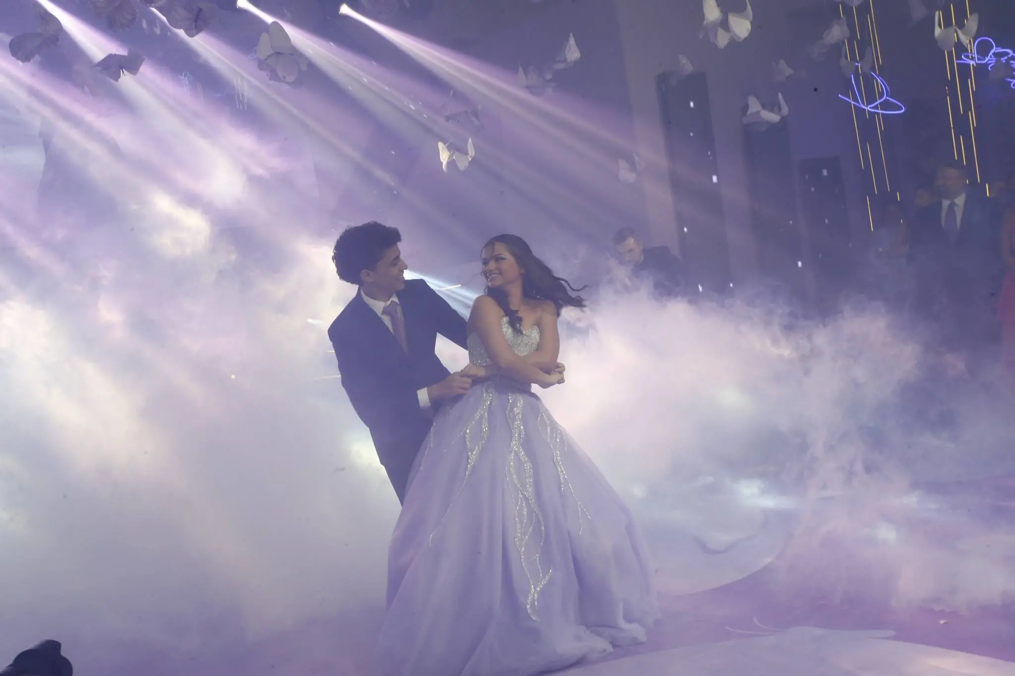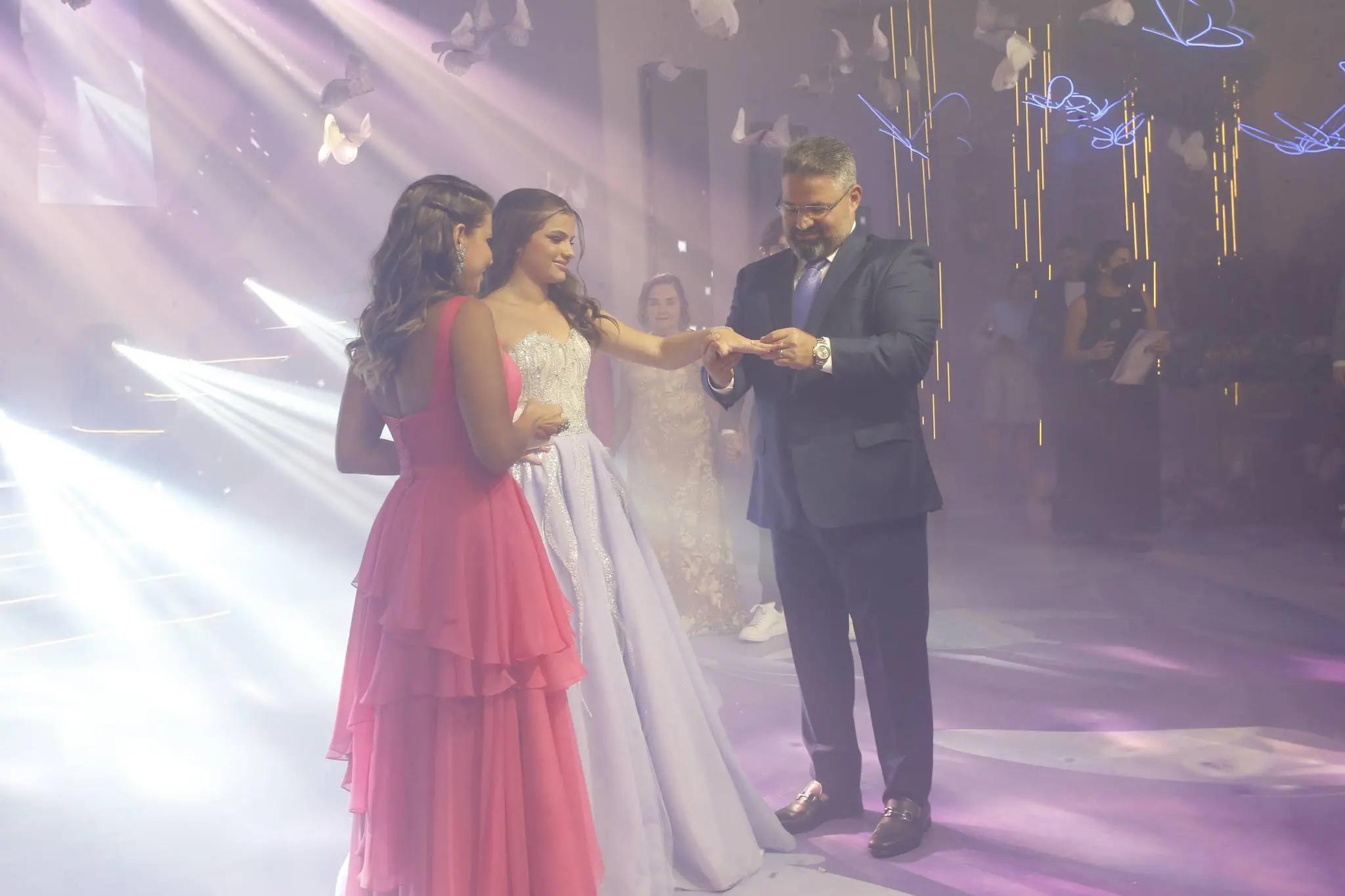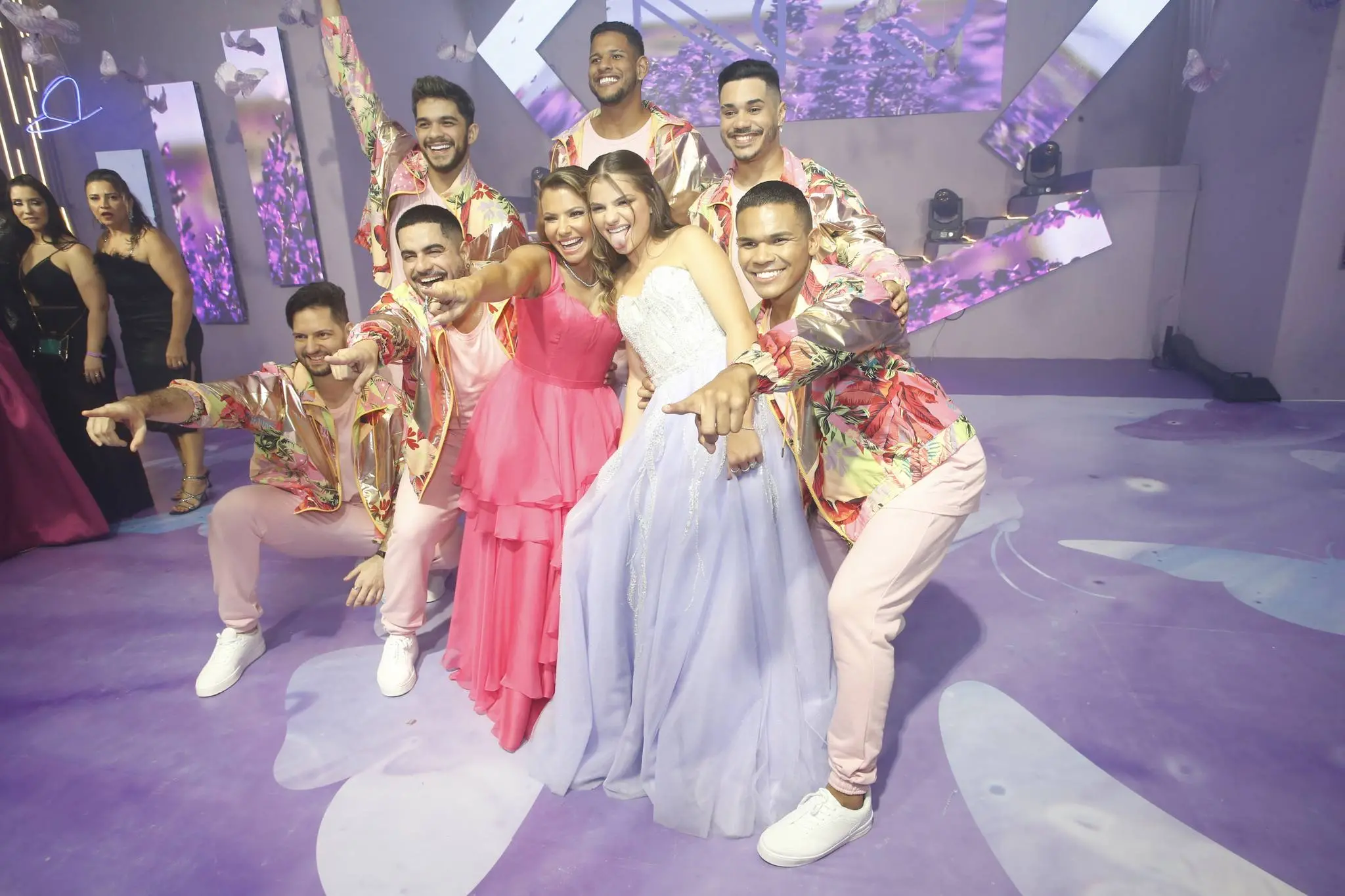 Gil Santos levou para o espaço um cenário em tonalidade lilás. Um jardim de borboletas, entre painéis de led variando lindas fotos da aniversariante. O bolo suspenso com vários andares foi uma atração à parte.