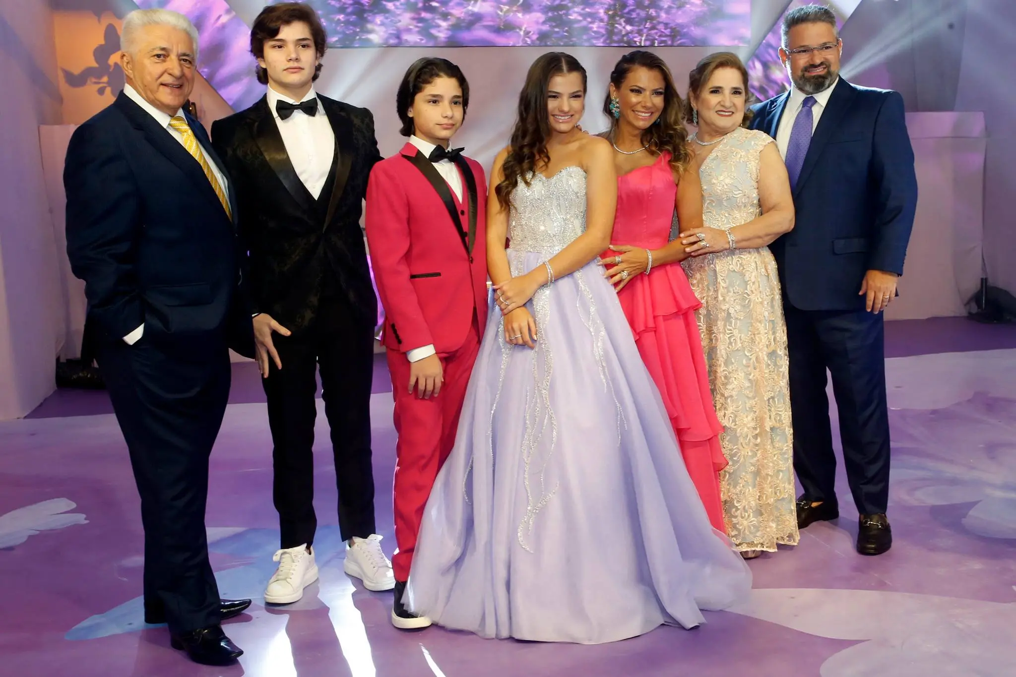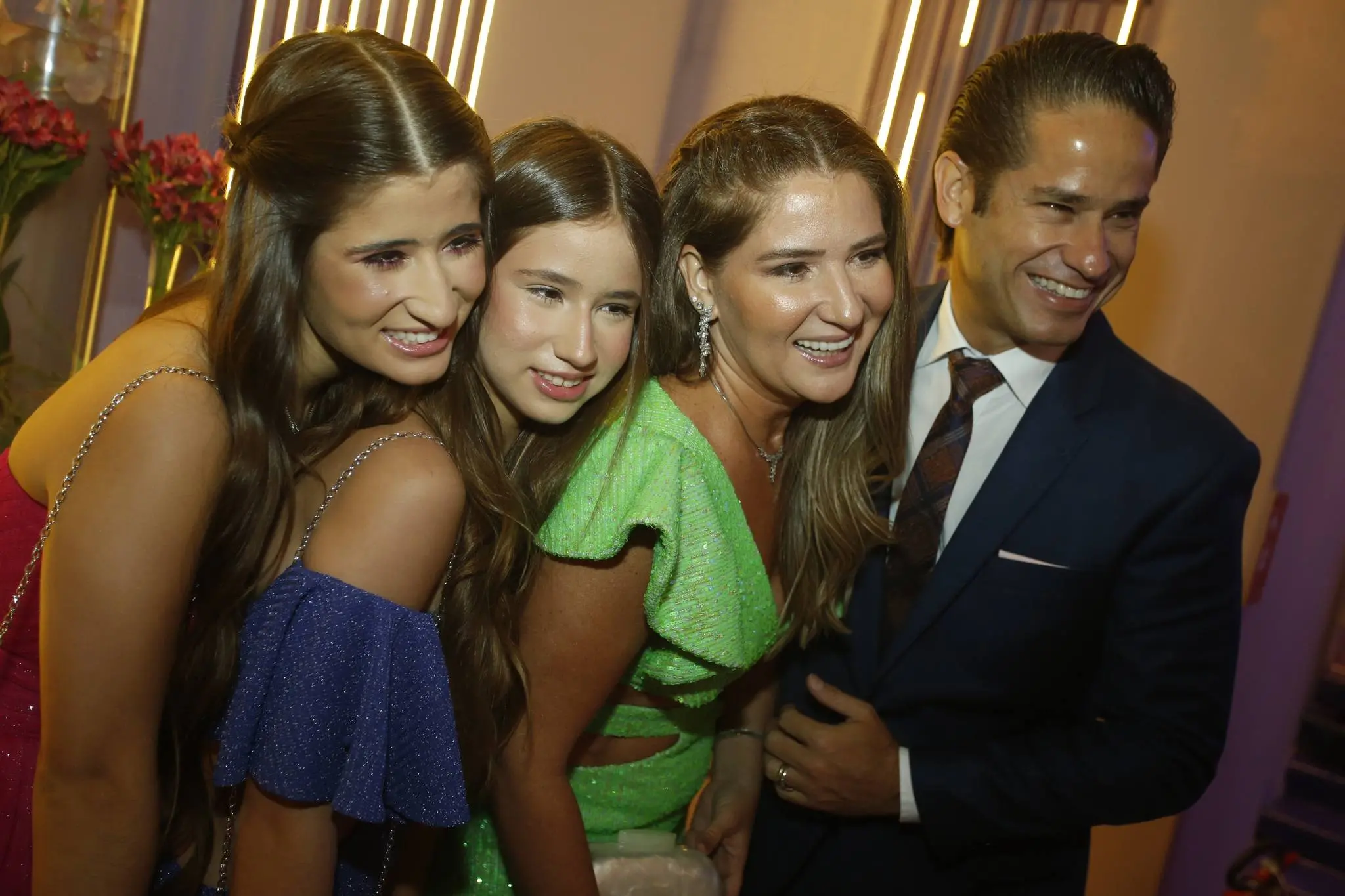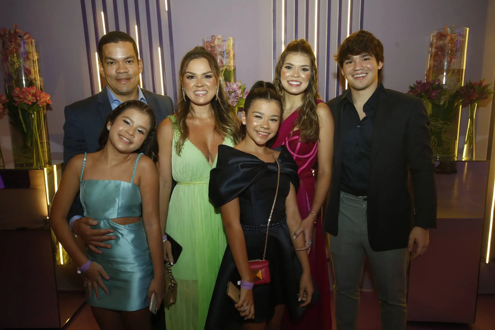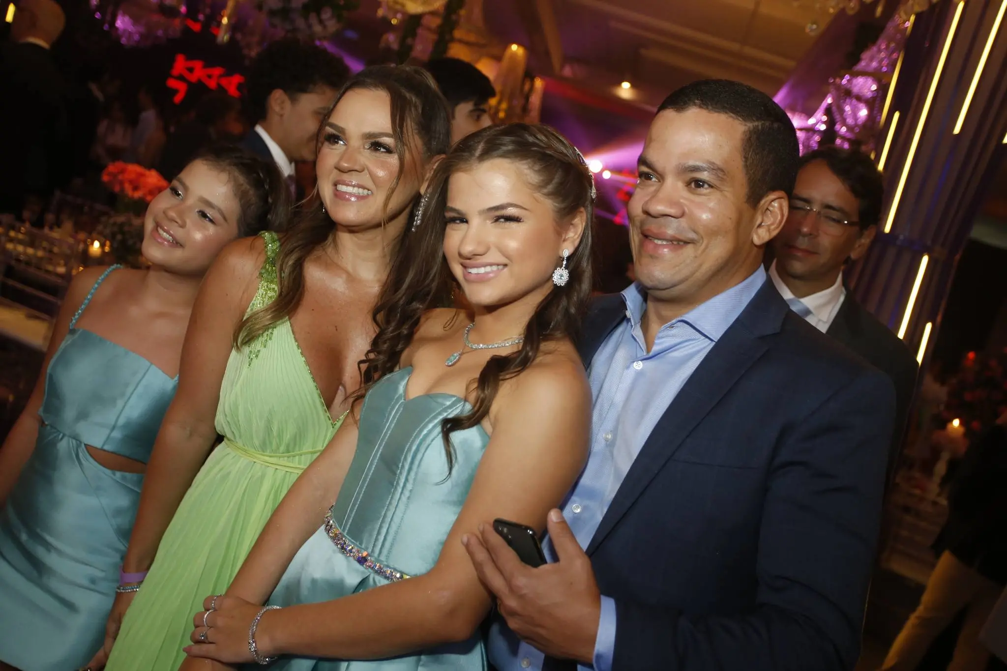 A família Almada Queirós estava elegantemente vestida. Todos dentro da paleta de cores da festa e/ou da aniversariante. Destaque para as mulheres da família: mãe e filha usando Ticiana Sampaio. Feitio exclusivo para o momento.