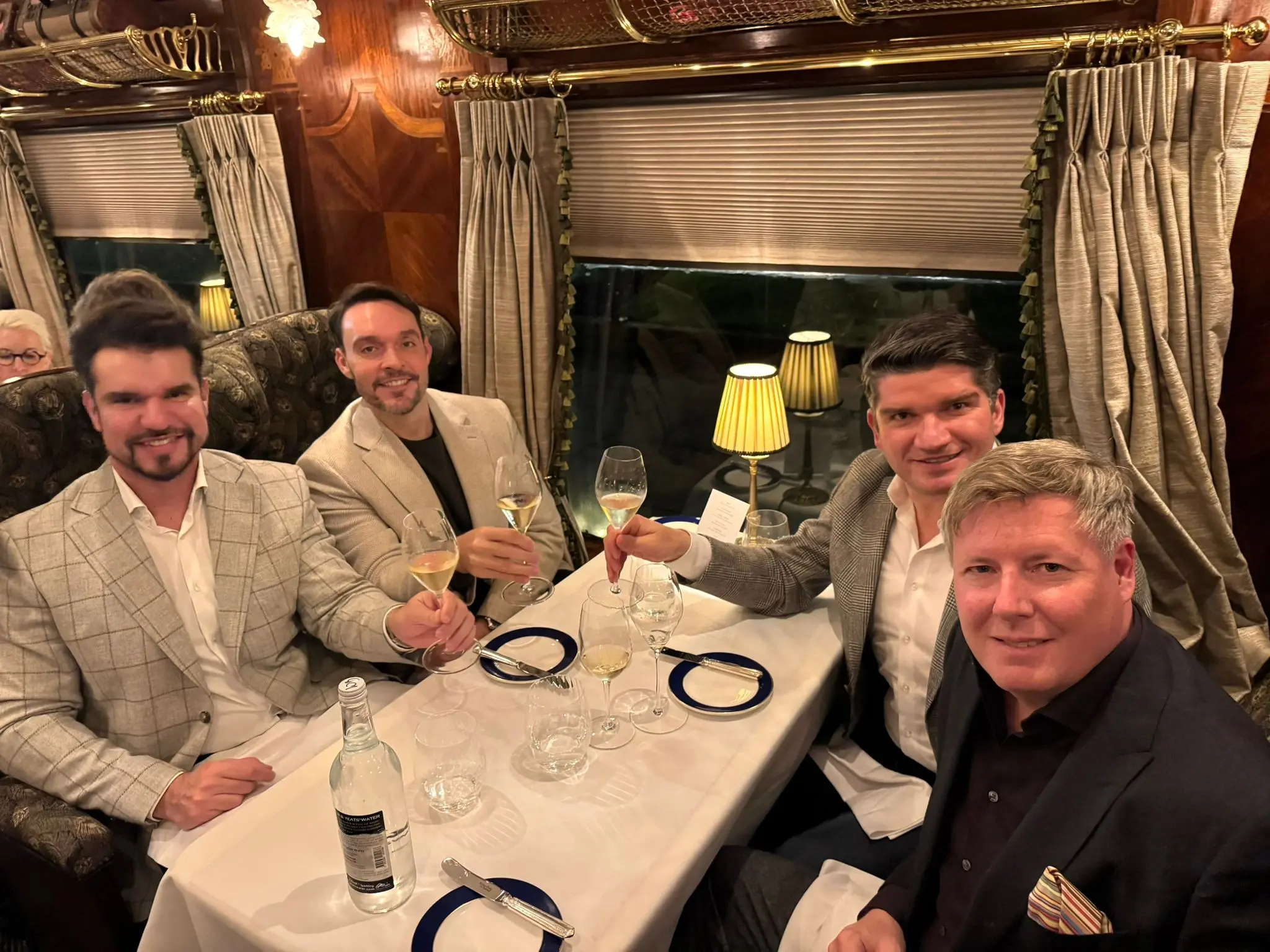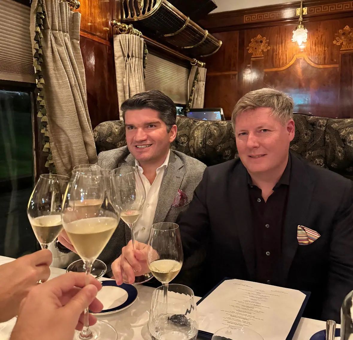 O brinde oficial aconteceu no estrelado Pullman Restaurant, onde o menu, assinado por chef com estrela Michelin, foi servido em uma carruagem original de 1927 do Orient Express. Puro glamour ferroviário.