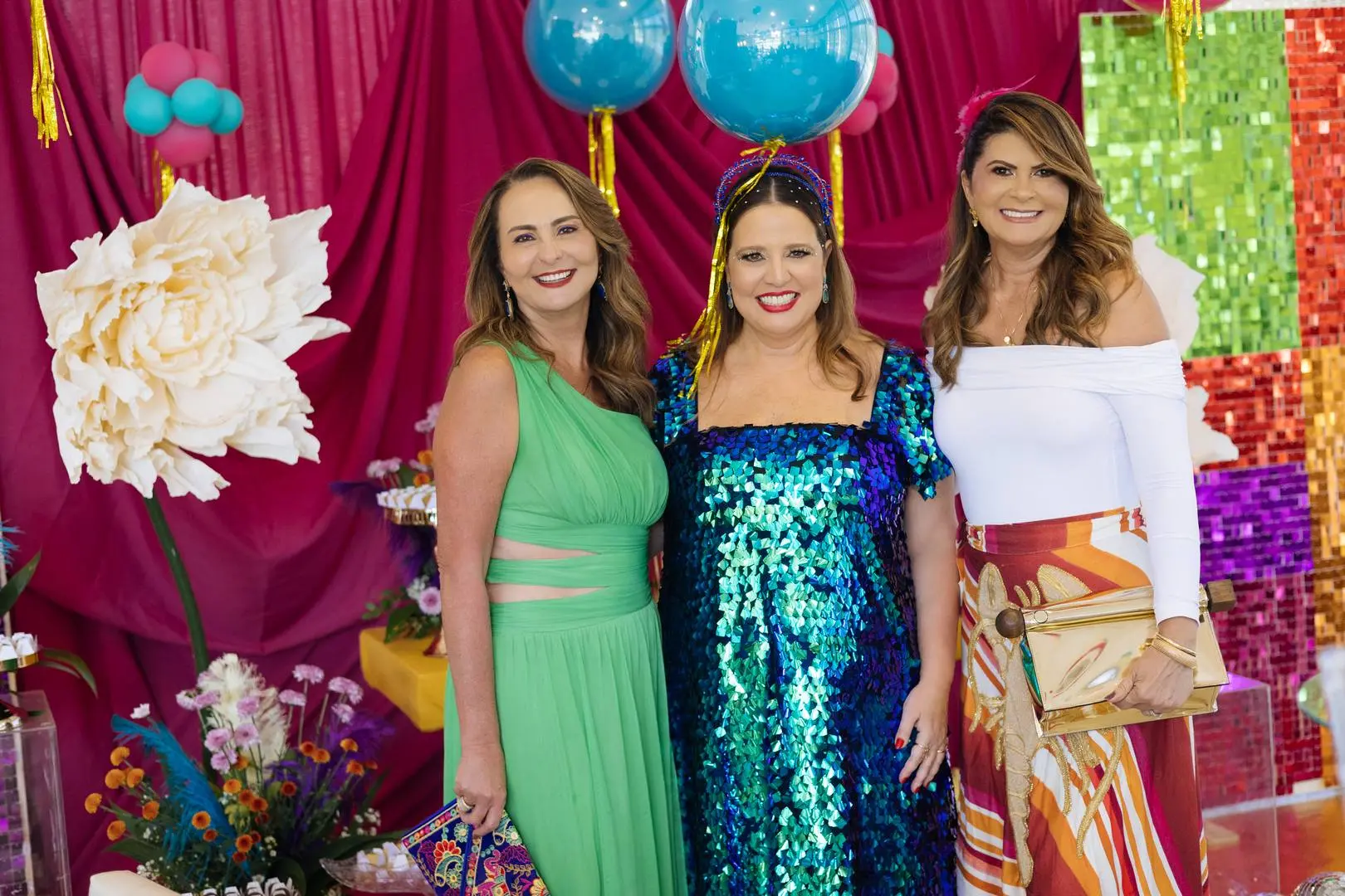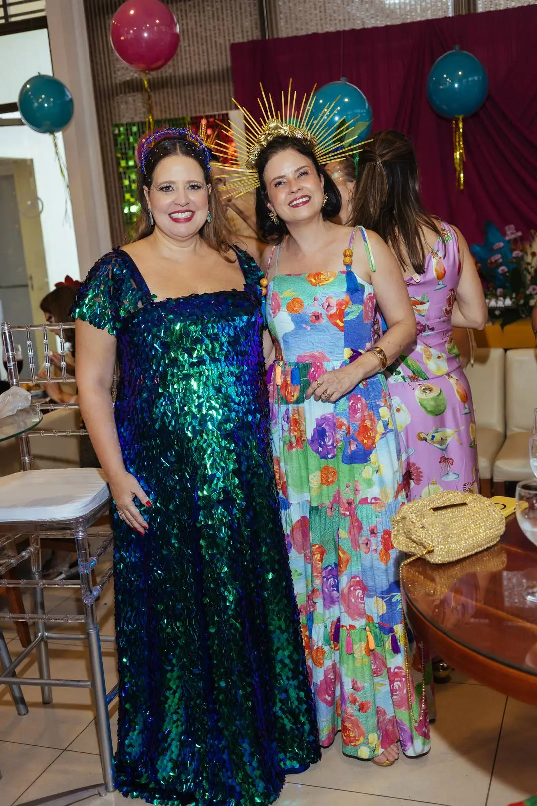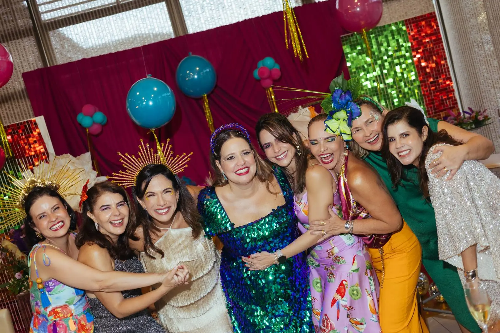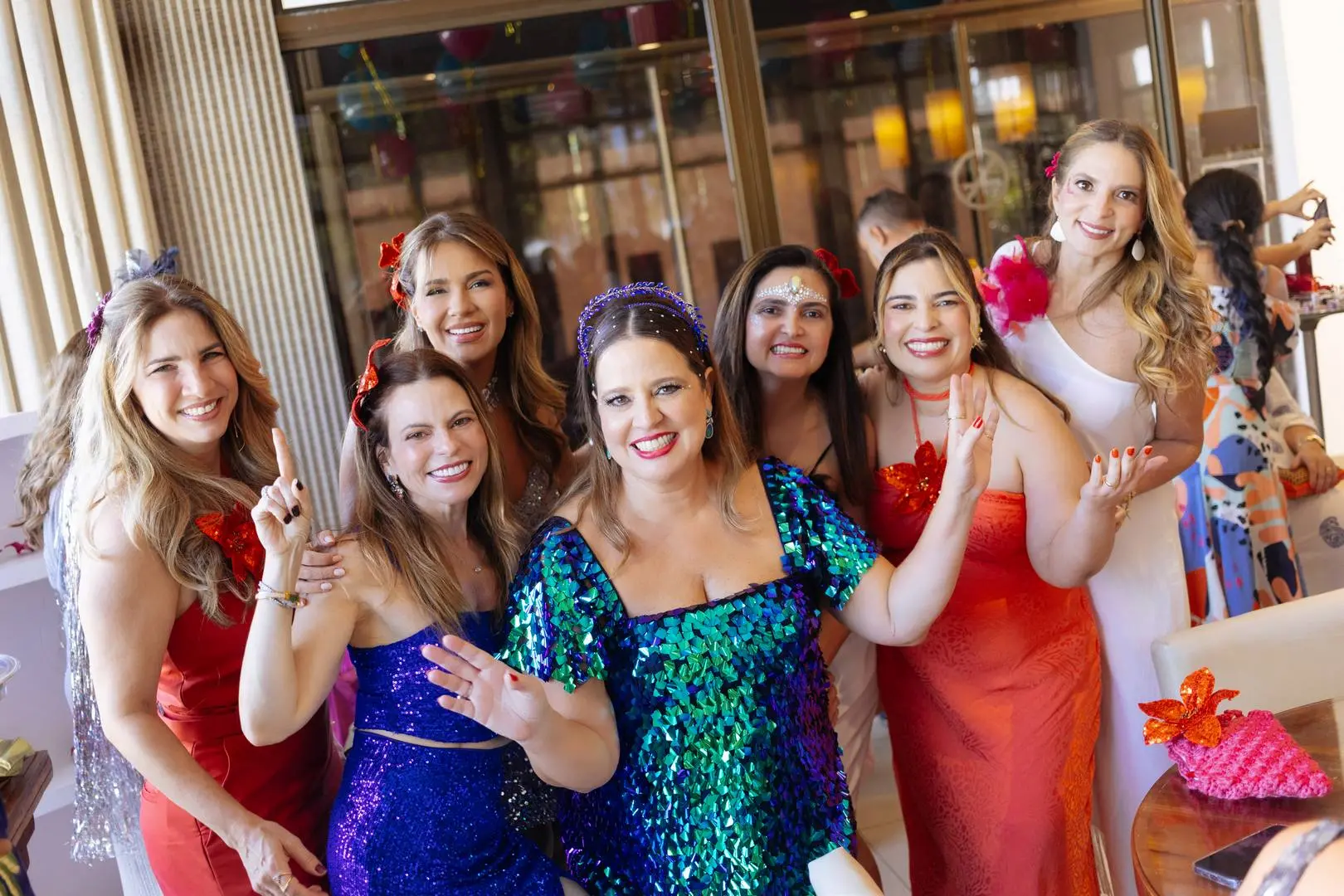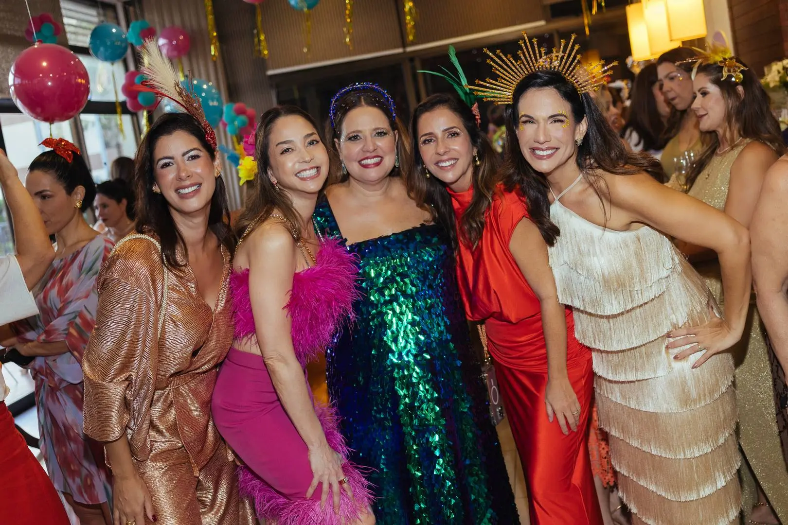 Amigas enfeitadas, animadíssimas e em sintonia com a anfitriã deram o tom da tarde: brilho é protocolo.
