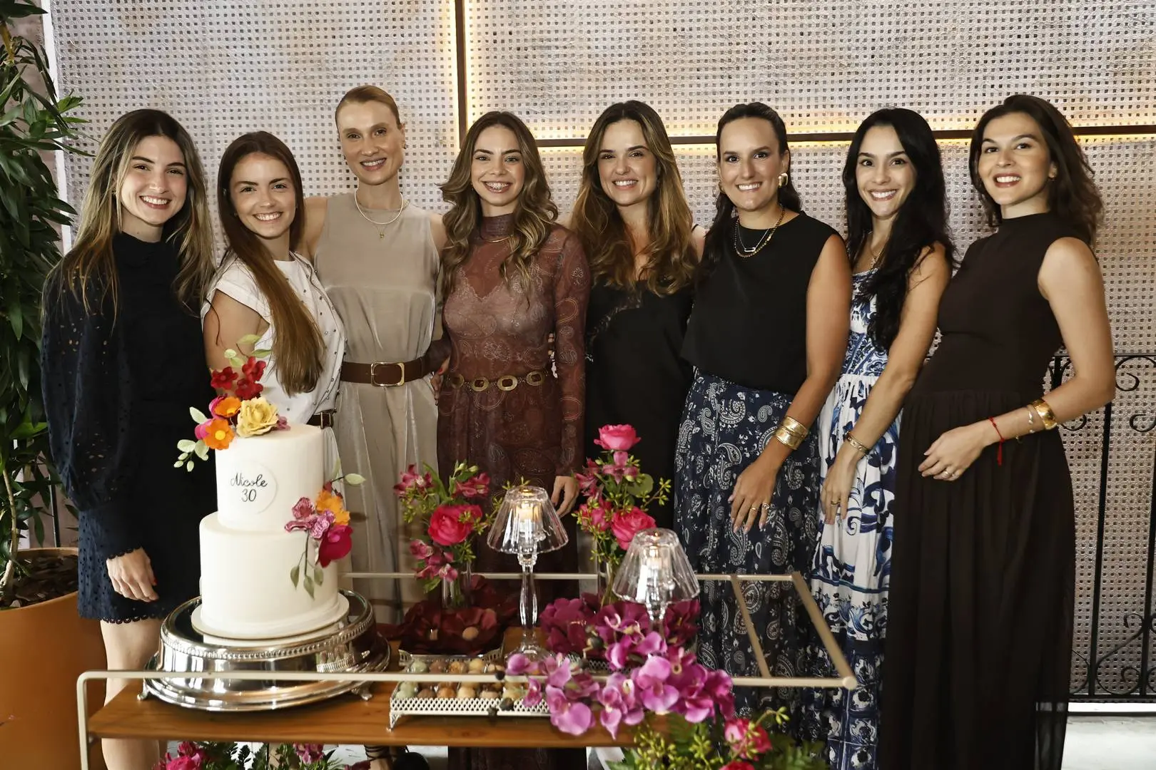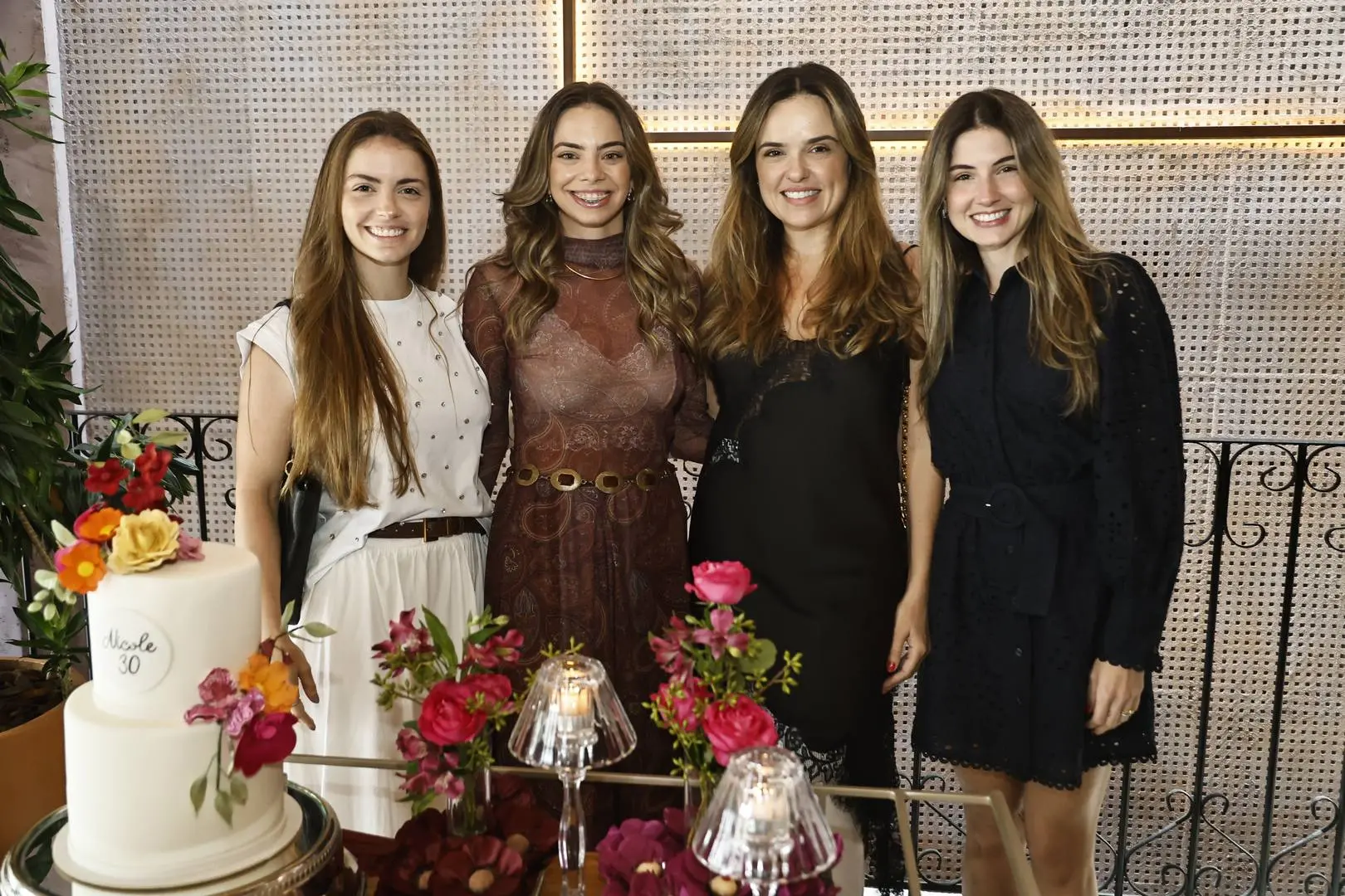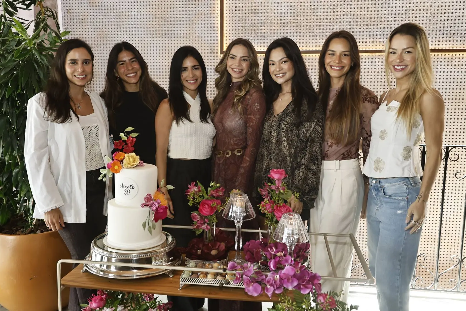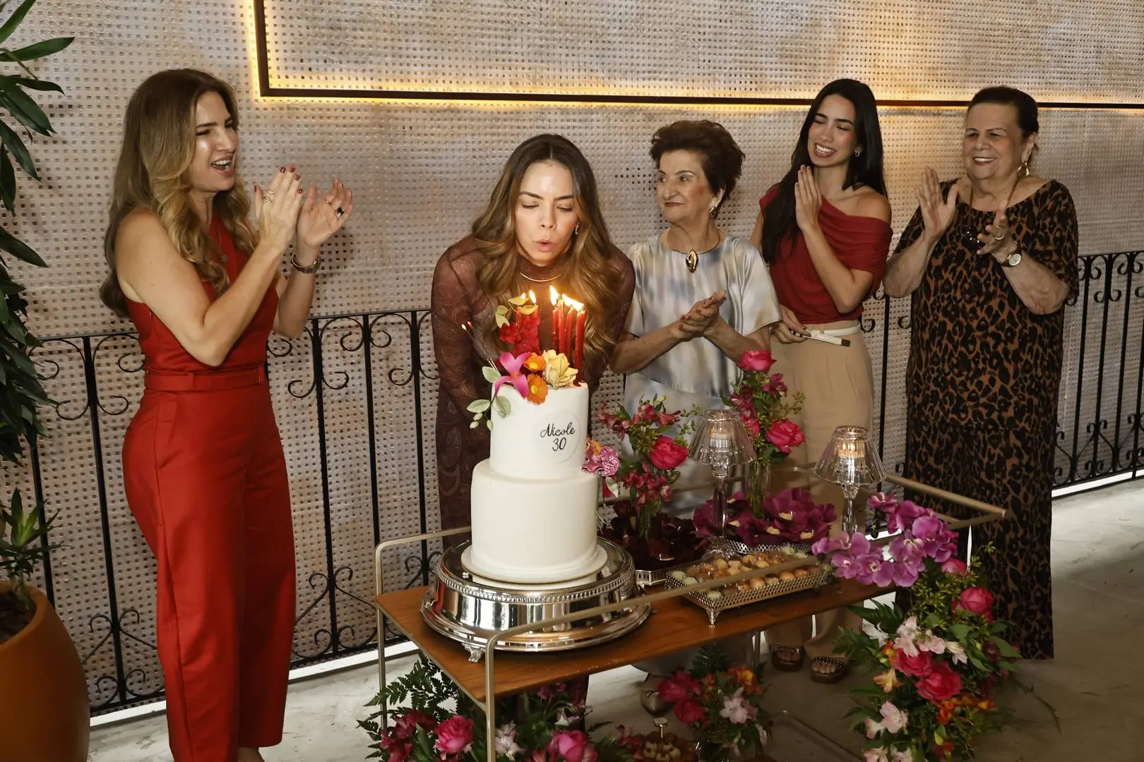 Ao chegar ao piso superior, Nicole foi envolvida por um coro afinado de parabéns, cercada por amigas e mulheres da família — cena de afeto com styling impecável.