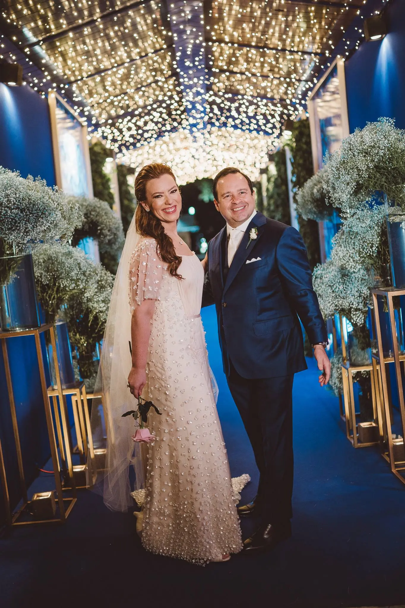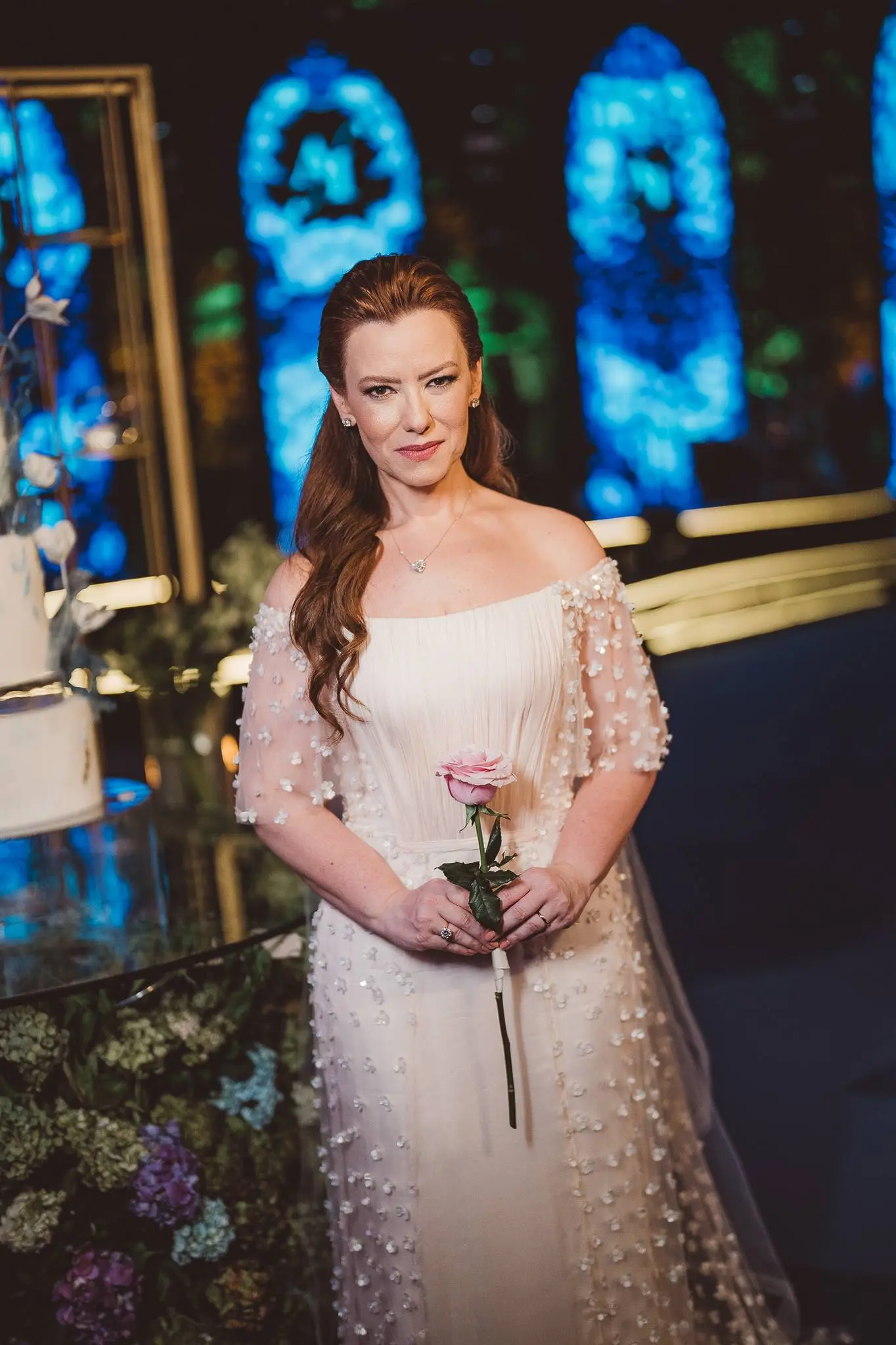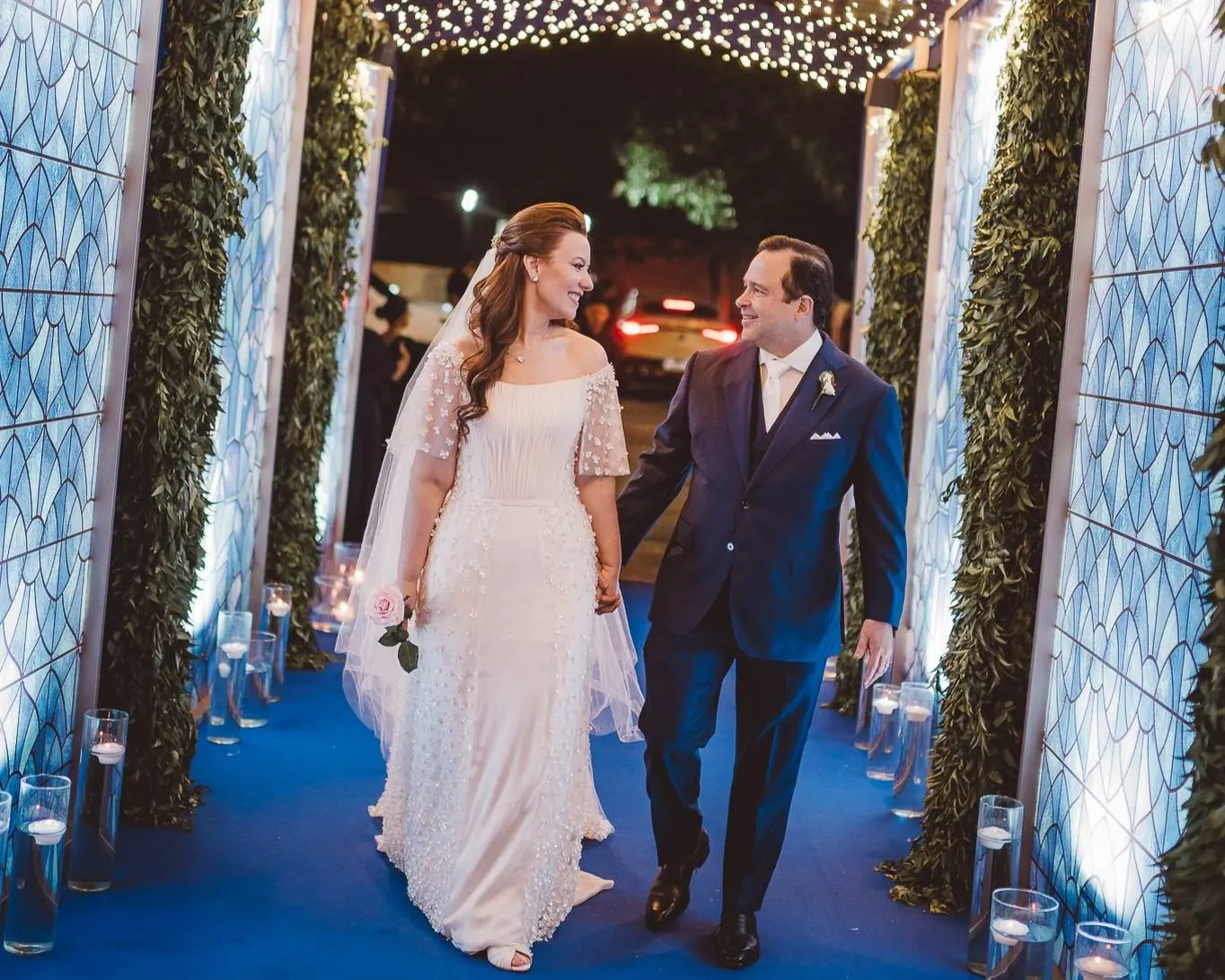Aline vestia um Júnior Santaella. Ombro a ombro. Joias clássicas. Na cabeça, Tiffany: brincos de pérola e broche da linha Apolo. Apenas uma linda rosa nas mãos. Lembrou-me uma princesa de Bridgerton. Romântica e elegante.