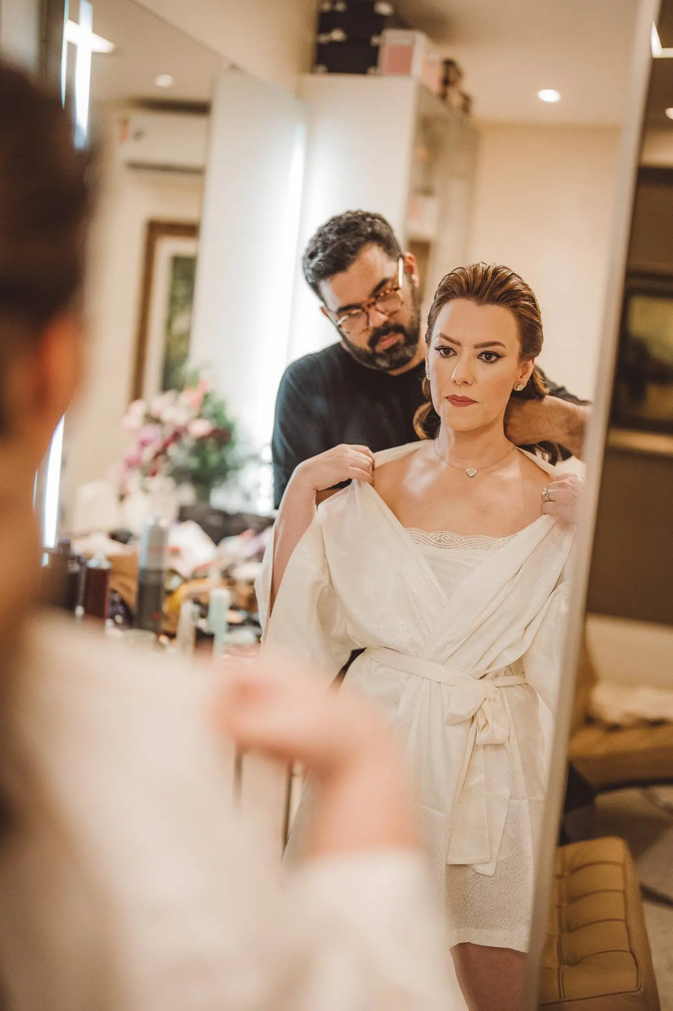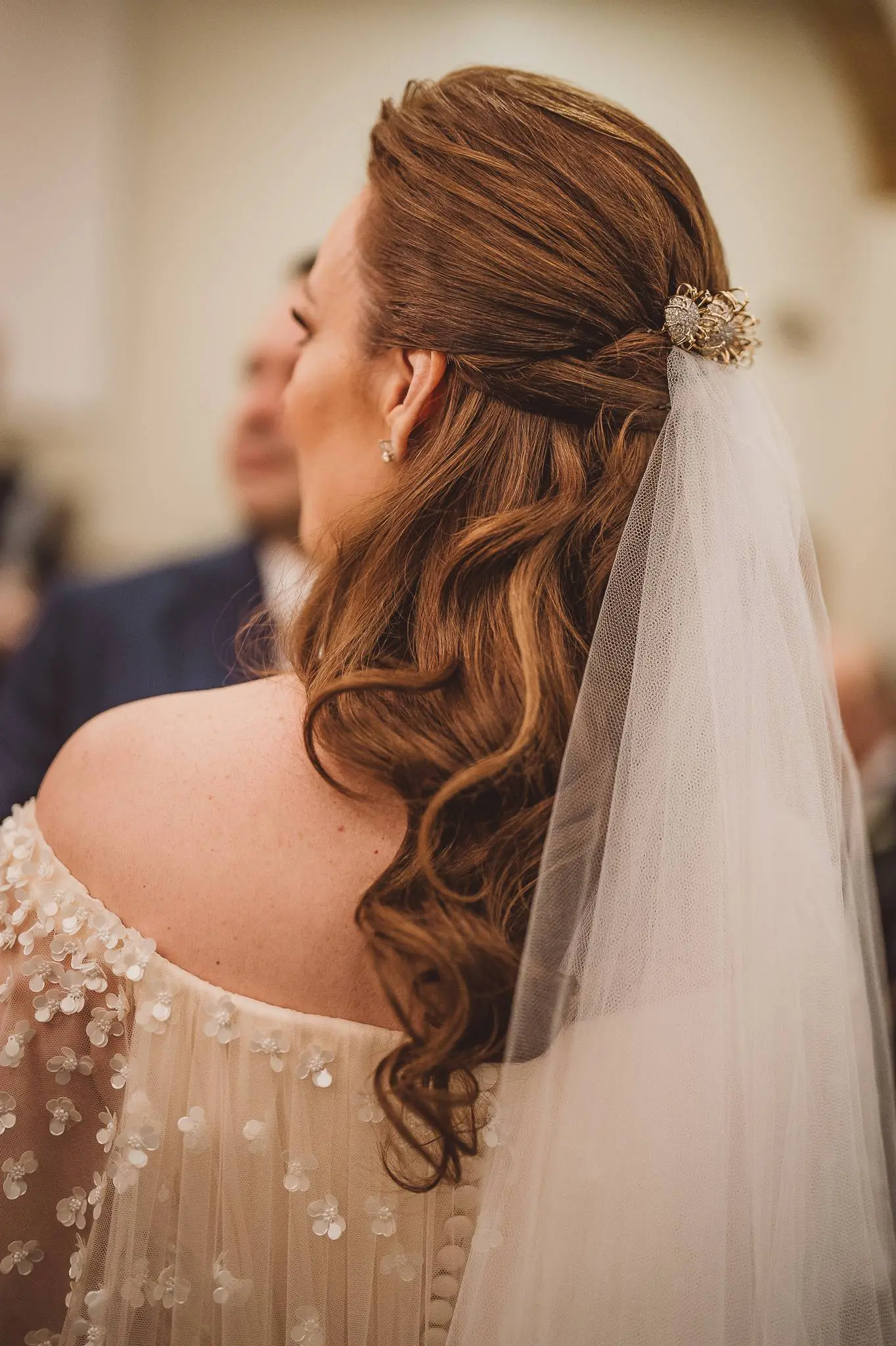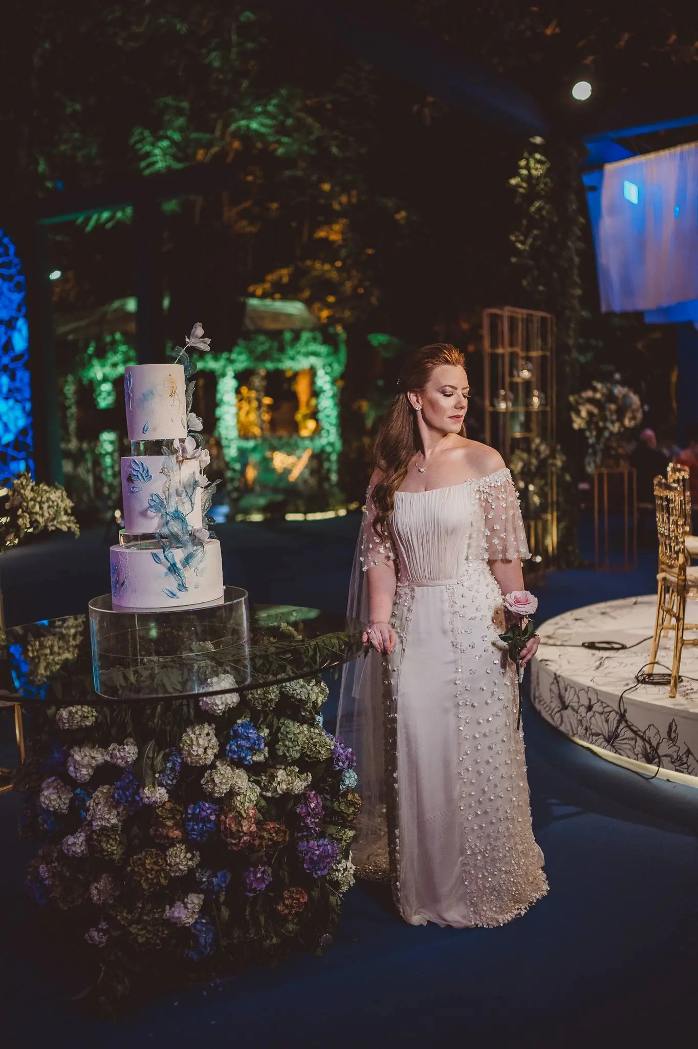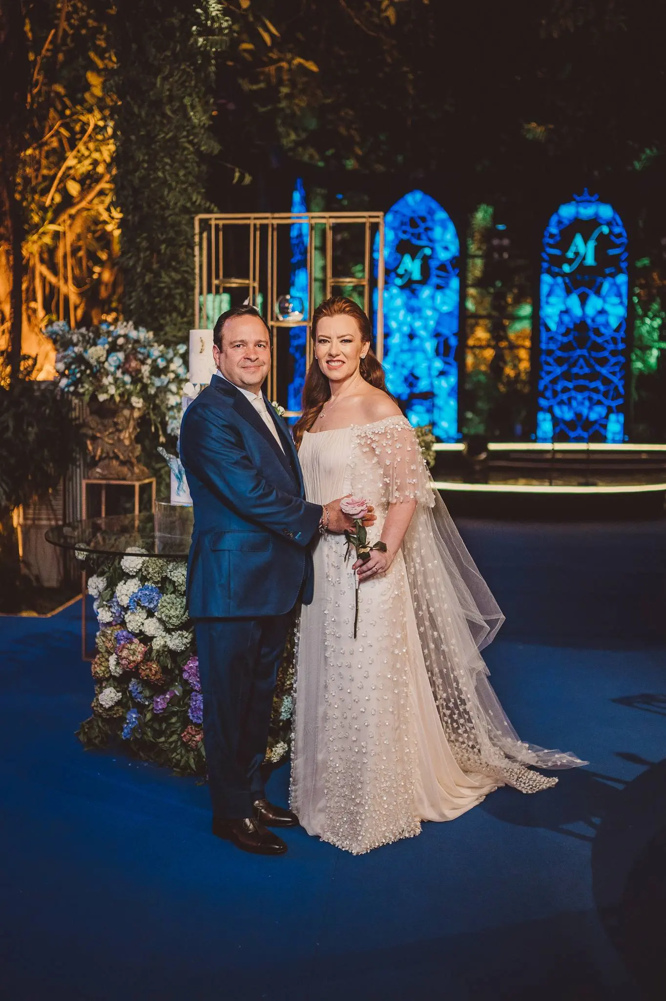 Aline vestia um Júnior Santaella. Ombro a ombro. Joias clássicas. Na cabeça, Tiffany: brincos de pérola e broche da linha Apolo. Apenas uma linda rosa nas mãos. Lembrou-me uma princesa de Bridgerton. Romântica e elegante.