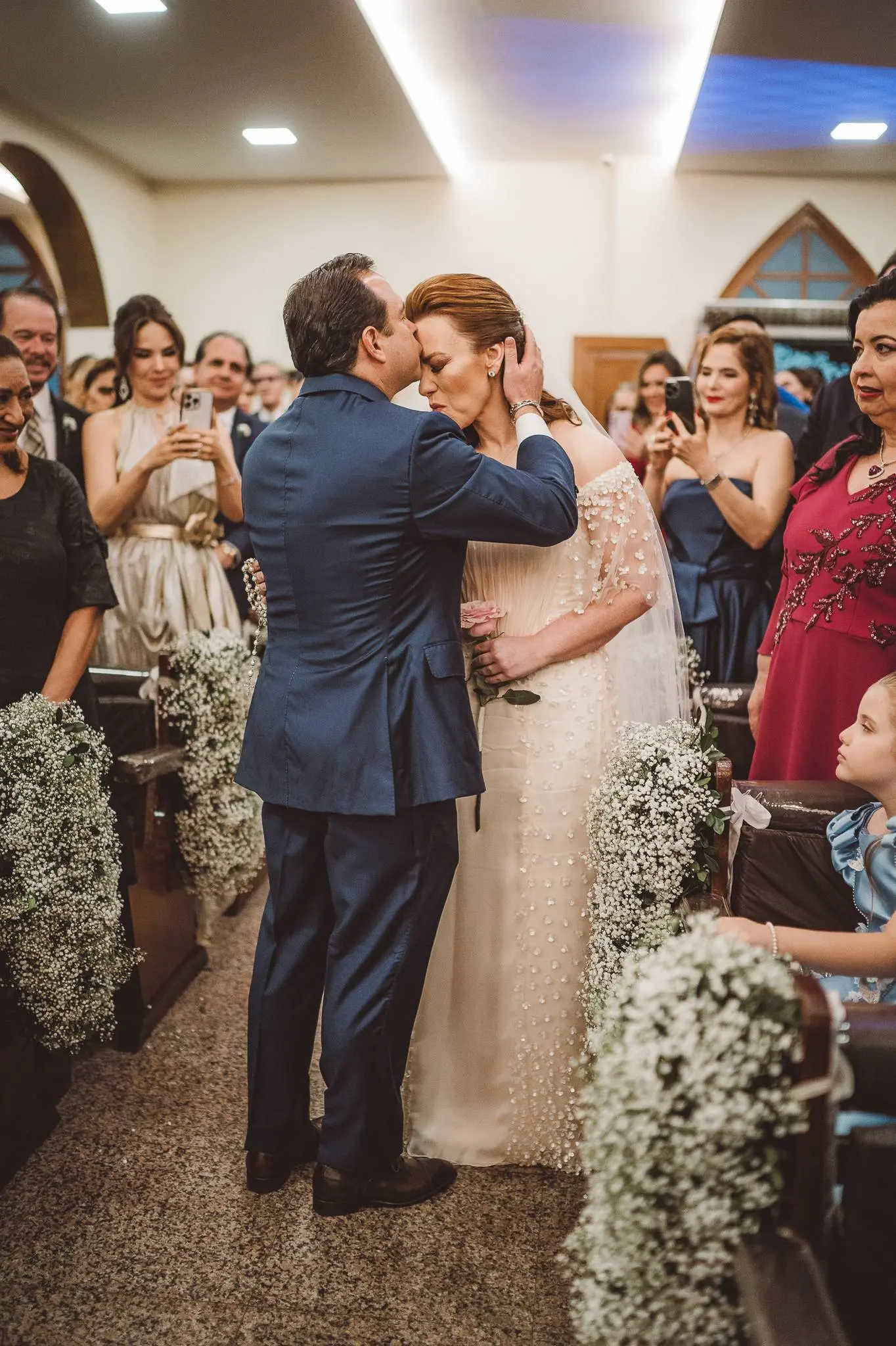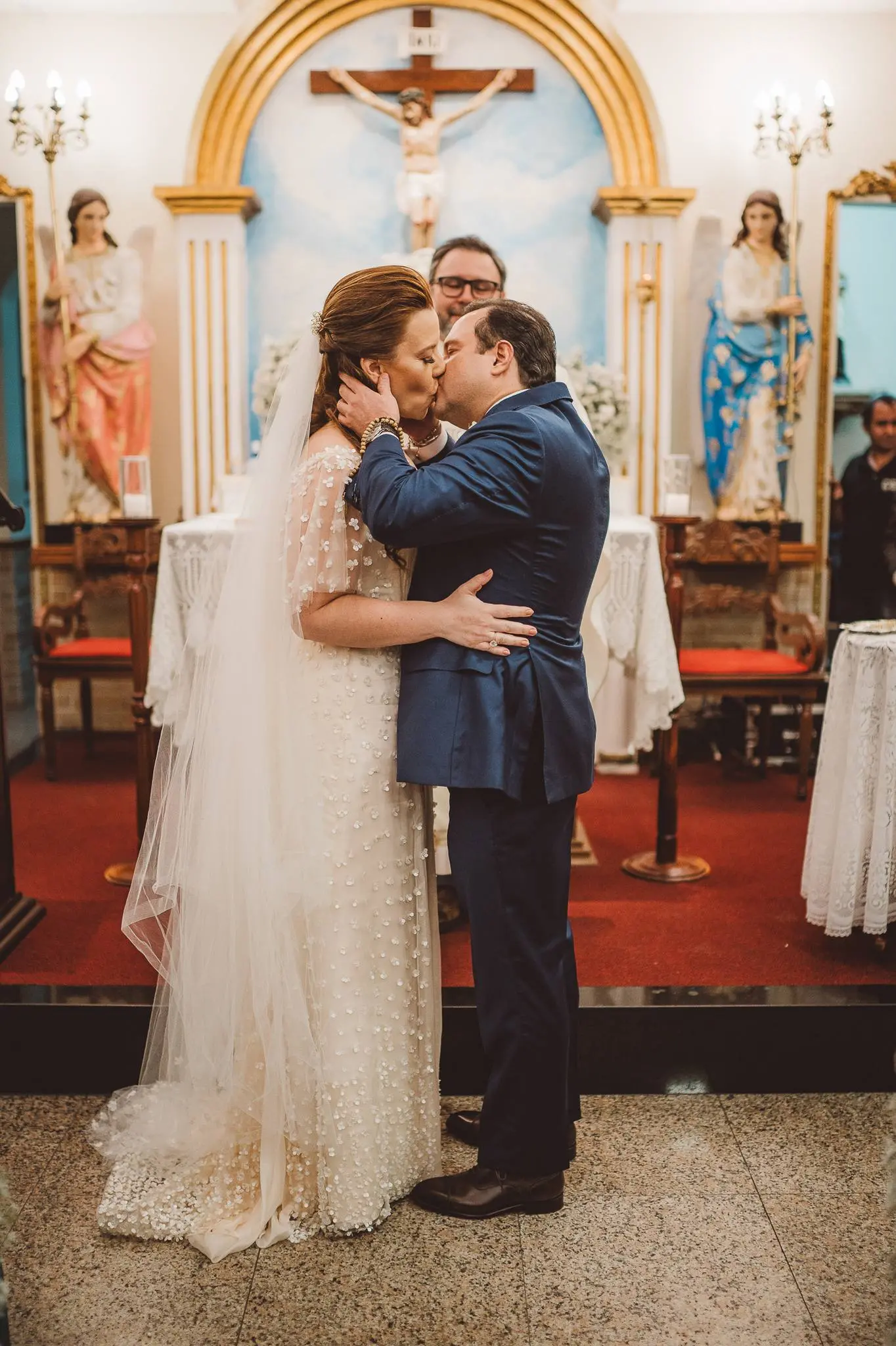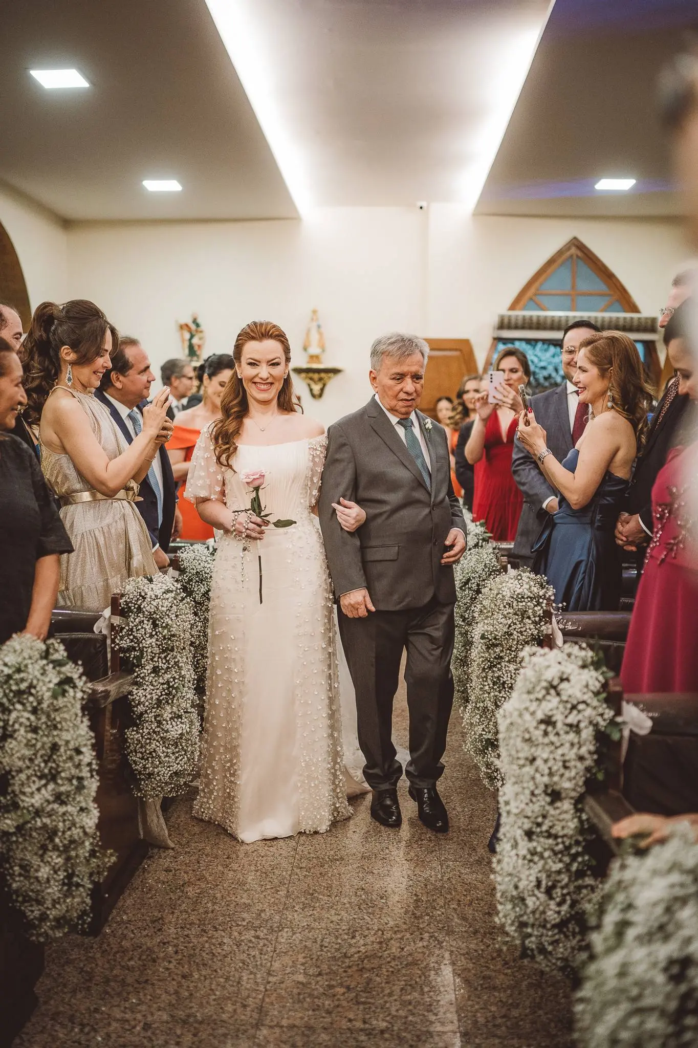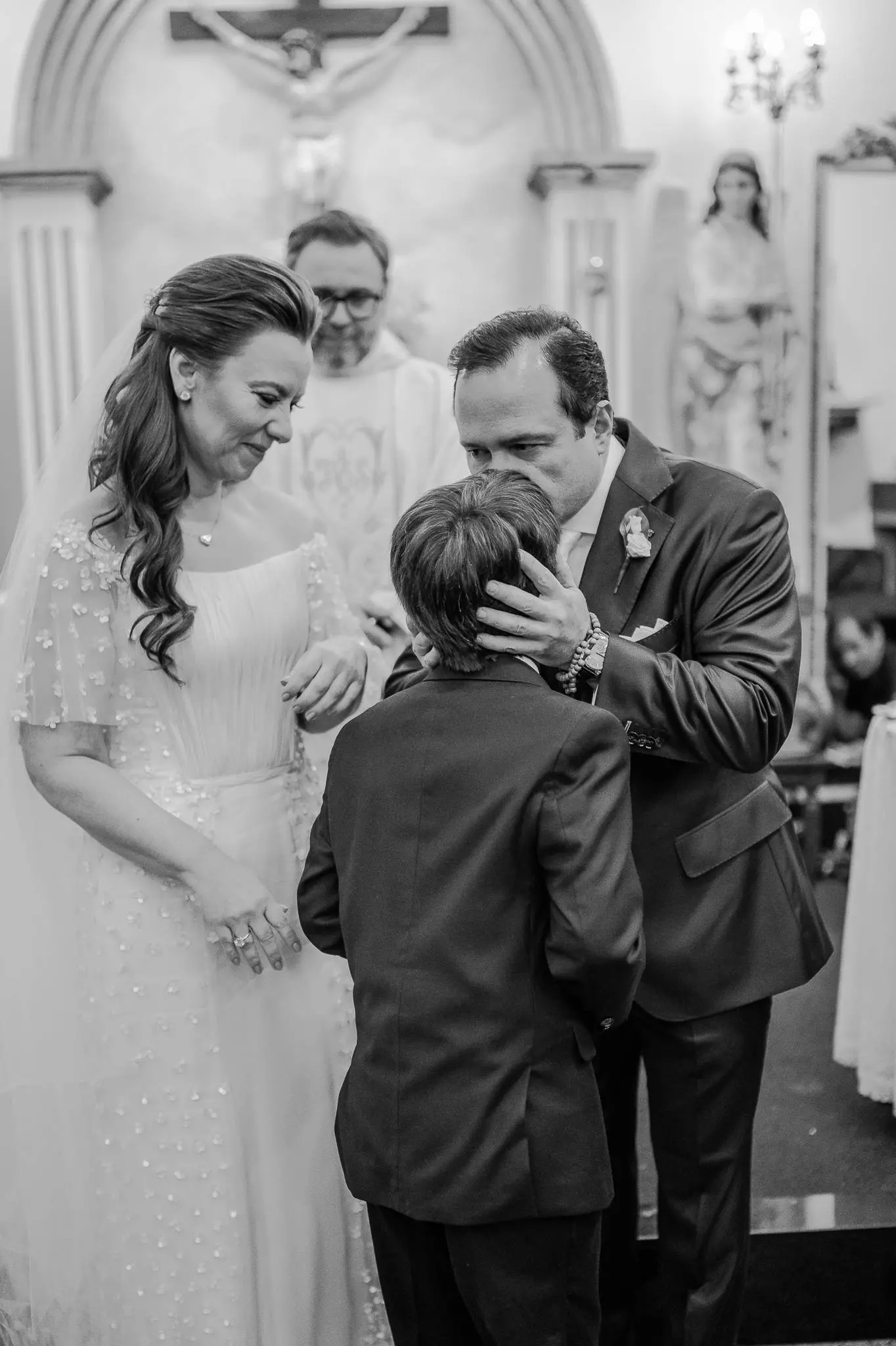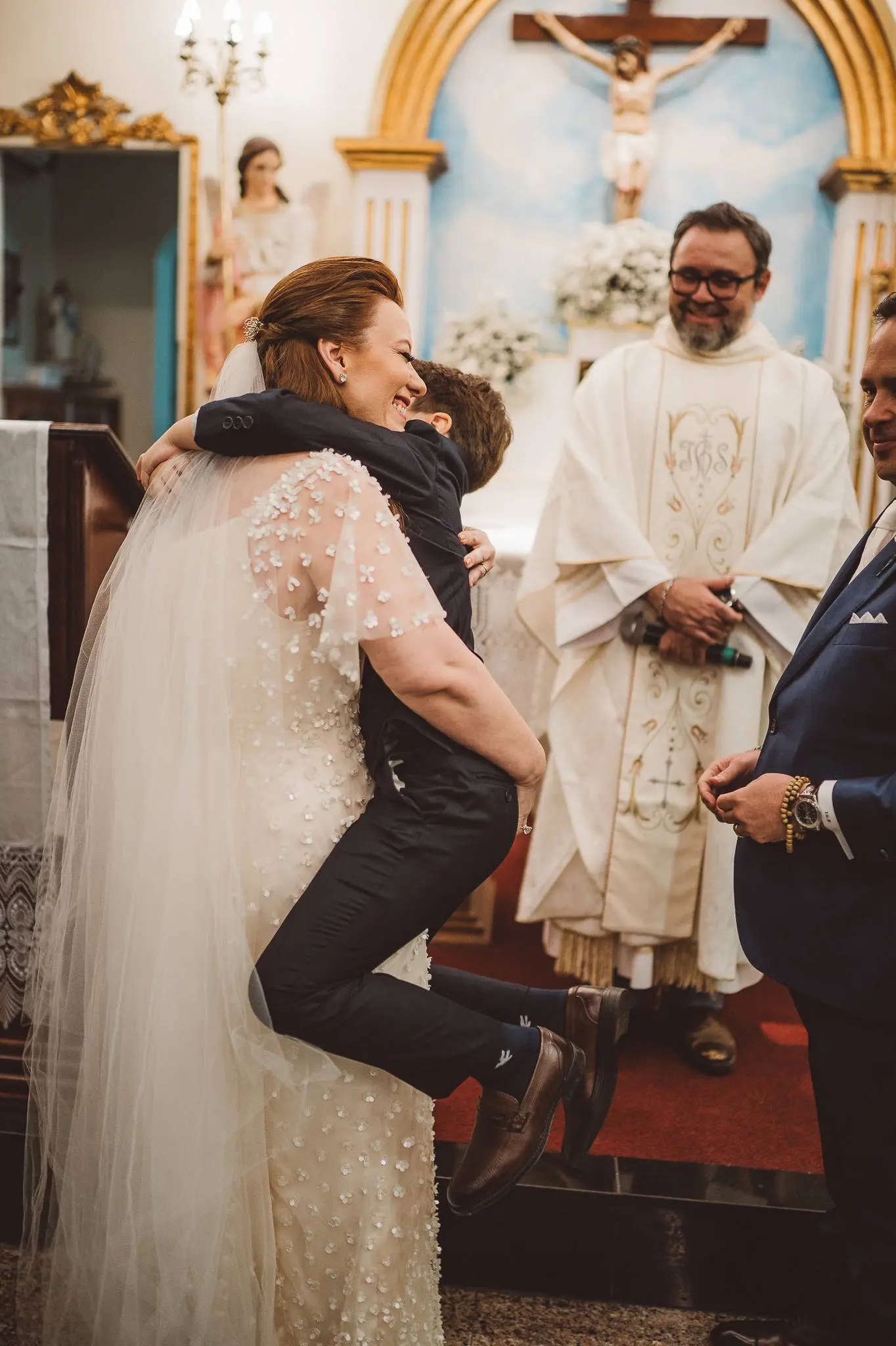 Aline entrou na igreja ao lado de seu pai, enquanto seu filho, Victor, levou as alianças. O momento foi ainda mais especial com a presença do Padre Duarte, amigo da família, que celebrou a cerimônia de forma carinhosa. Lucas Queiroz fez a primeira leitura. No final, o padre Duarte convidou Victor Queiroz Barroso para anunciar que os pais/noivos estavam casados! Foi lindo! Aline e Igor trocaram votos e se emocionaram durante toda a cerimônia.