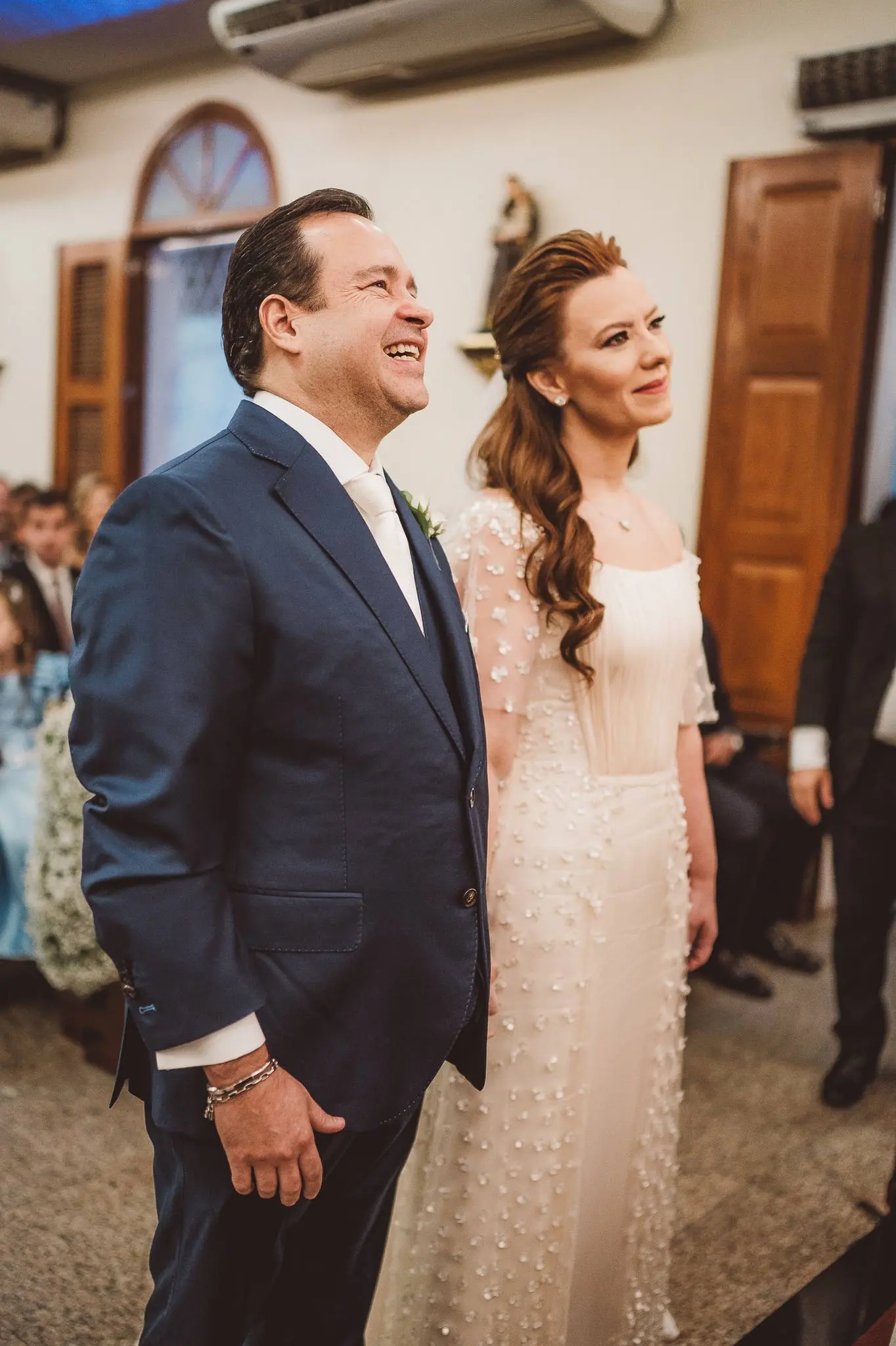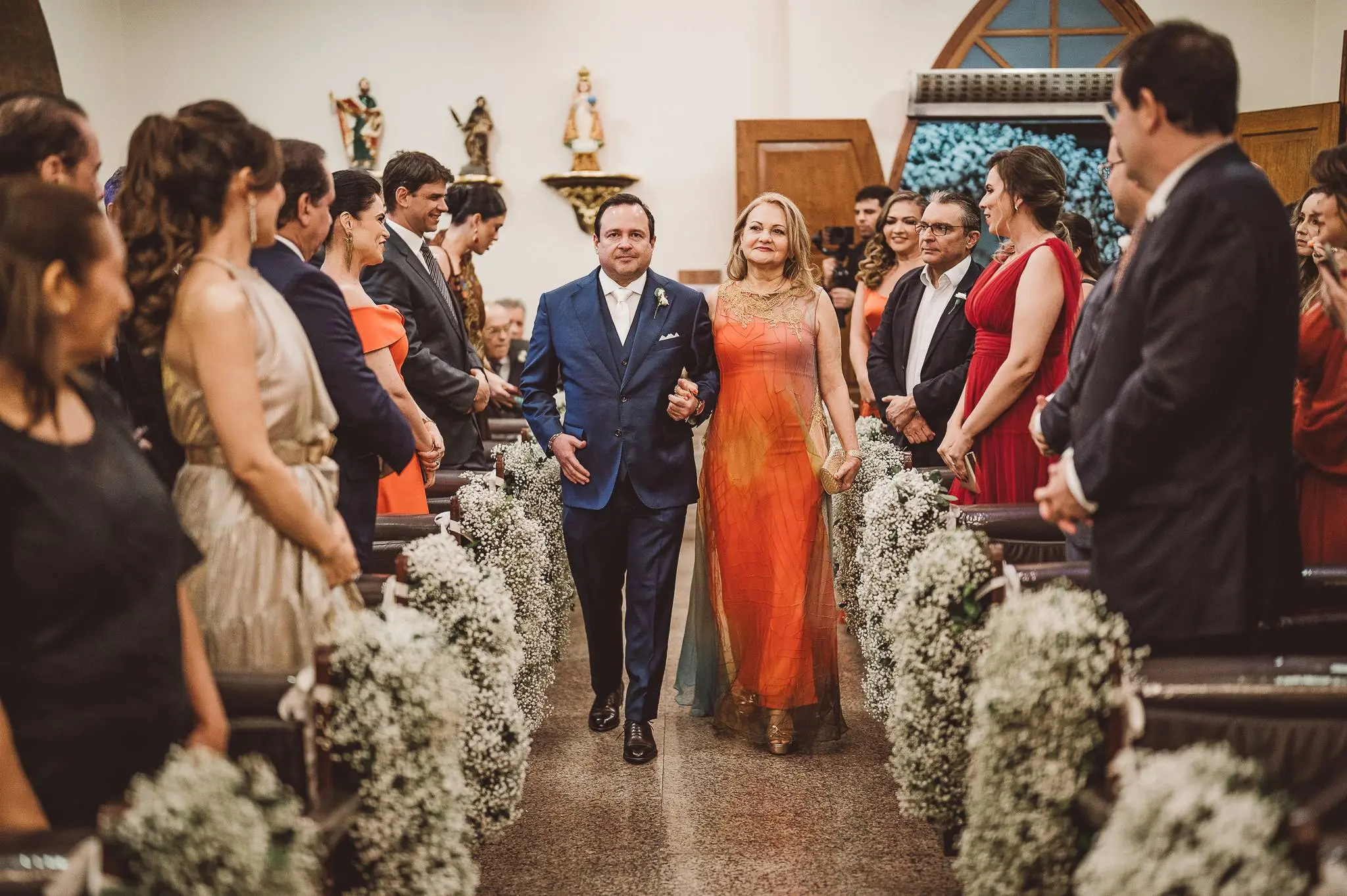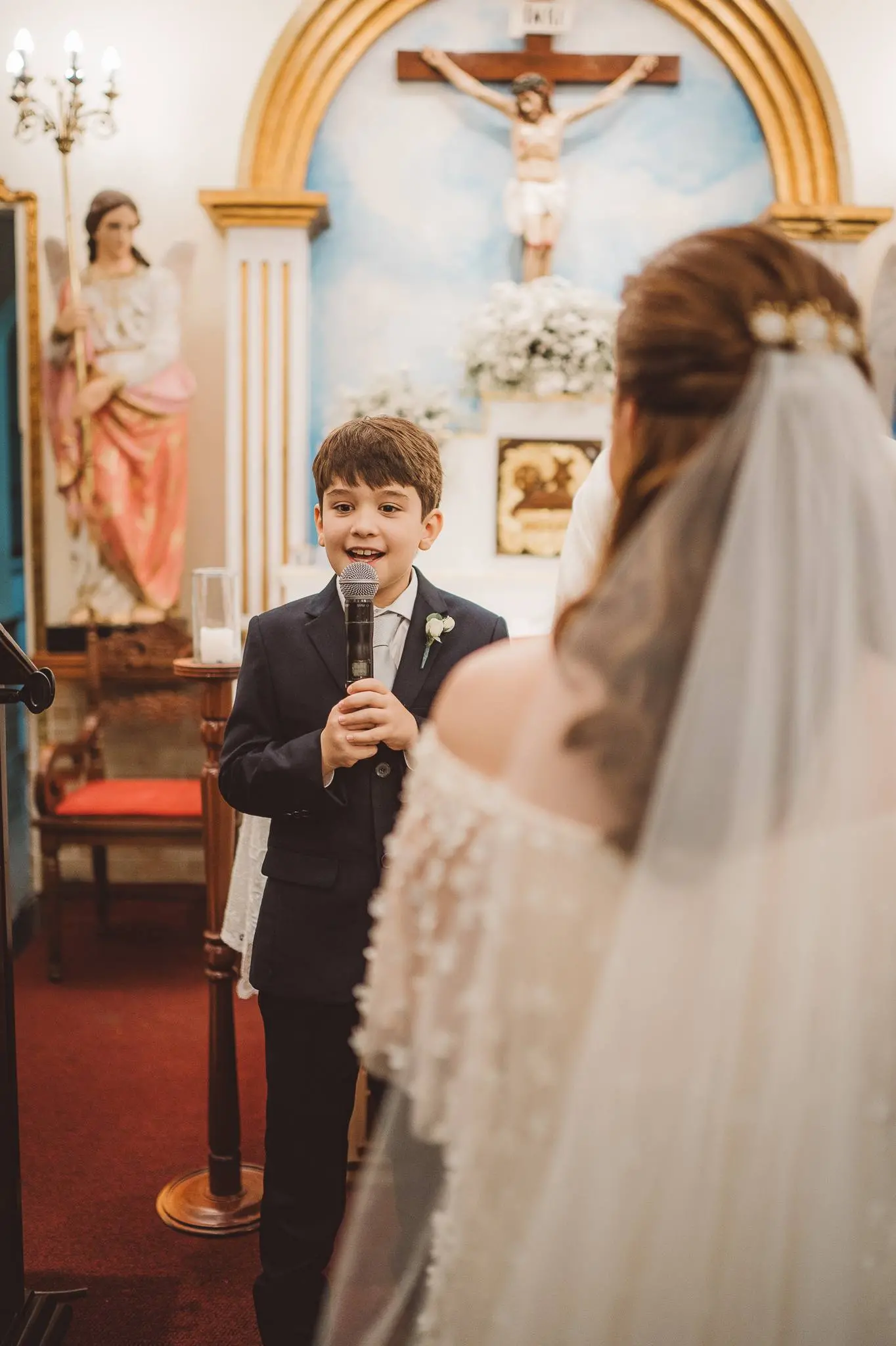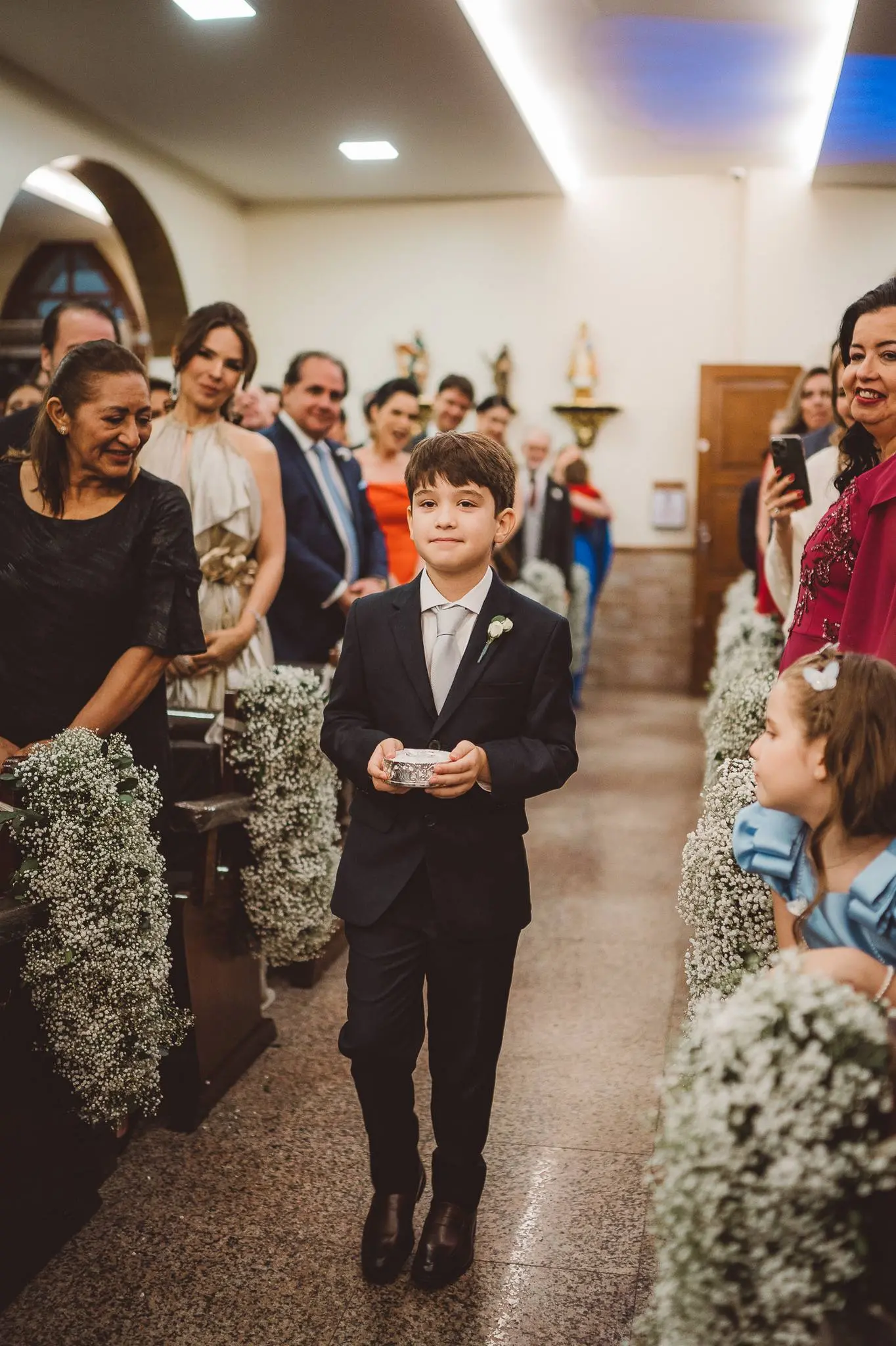 Aline entrou na igreja ao lado de seu pai, enquanto seu filho, Victor, levou as alianças. O momento foi ainda mais especial com a presença do Padre Duarte, amigo da família, que celebrou a cerimônia de forma carinhosa. Lucas Queiroz fez a primeira leitura. No final, o padre Duarte convidou Victor Queiroz Barroso para anunciar que os pais/noivos estavam casados! Foi lindo! Aline e Igor trocaram votos e se emocionaram durante toda a cerimônia.