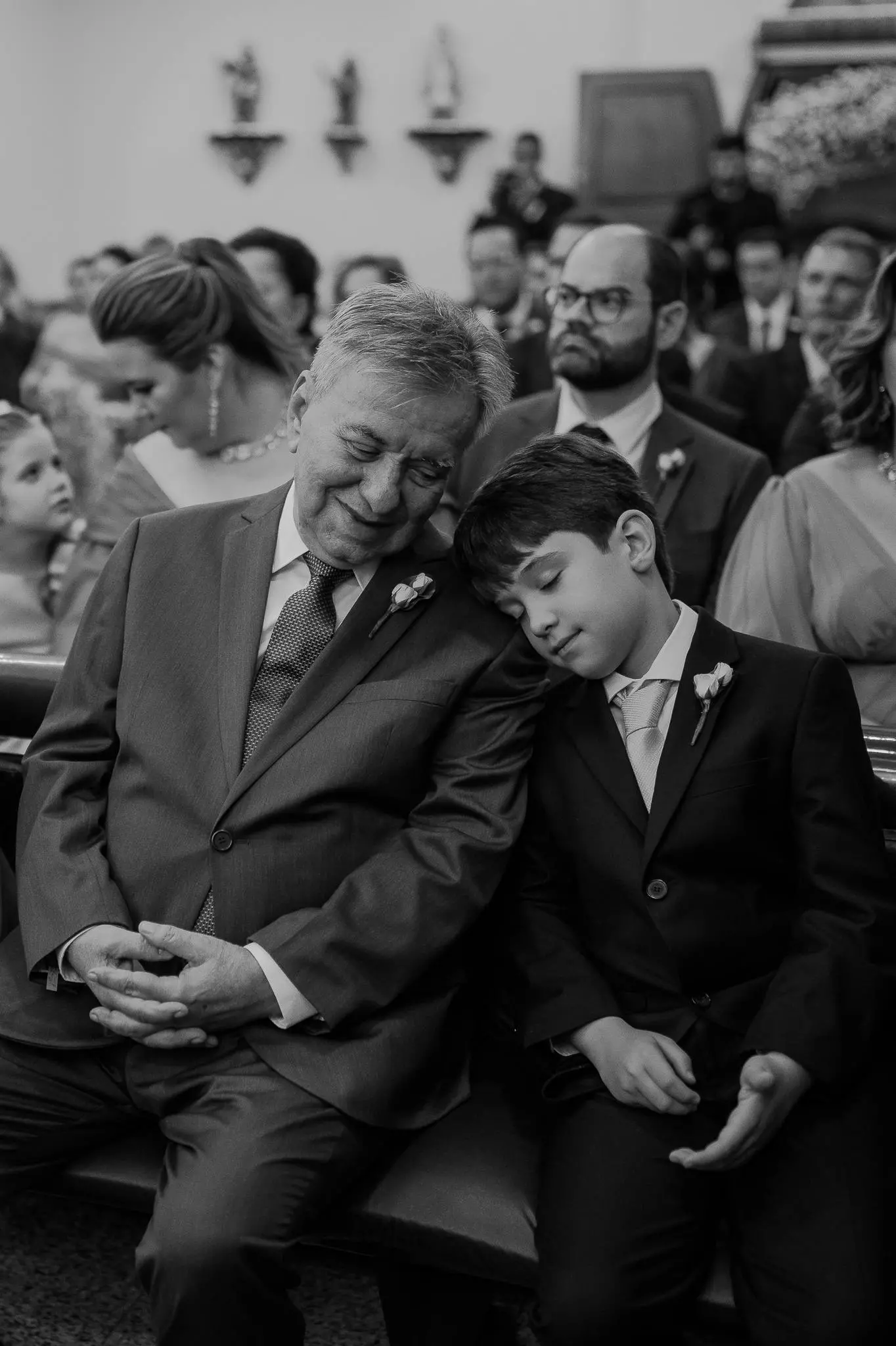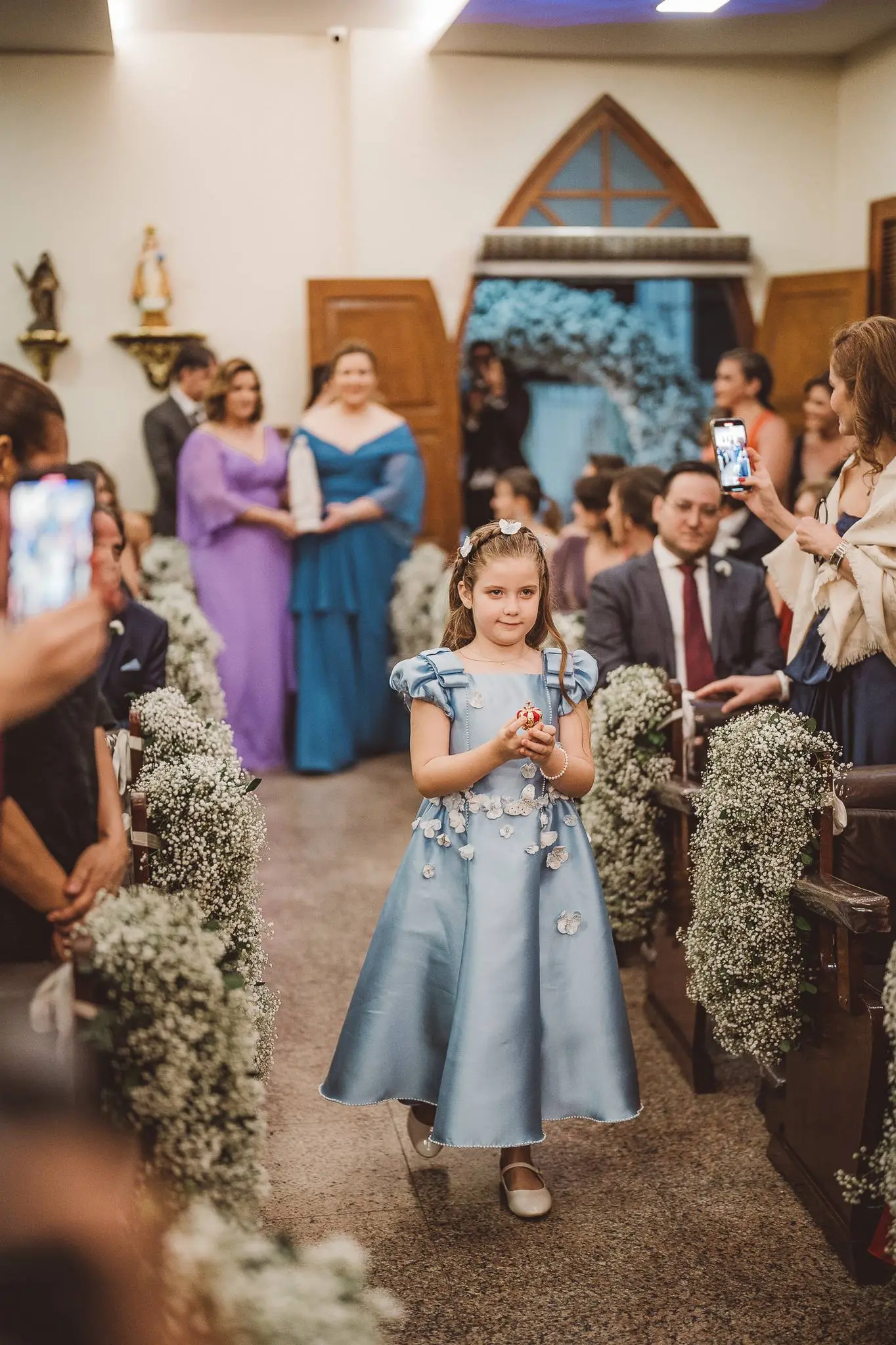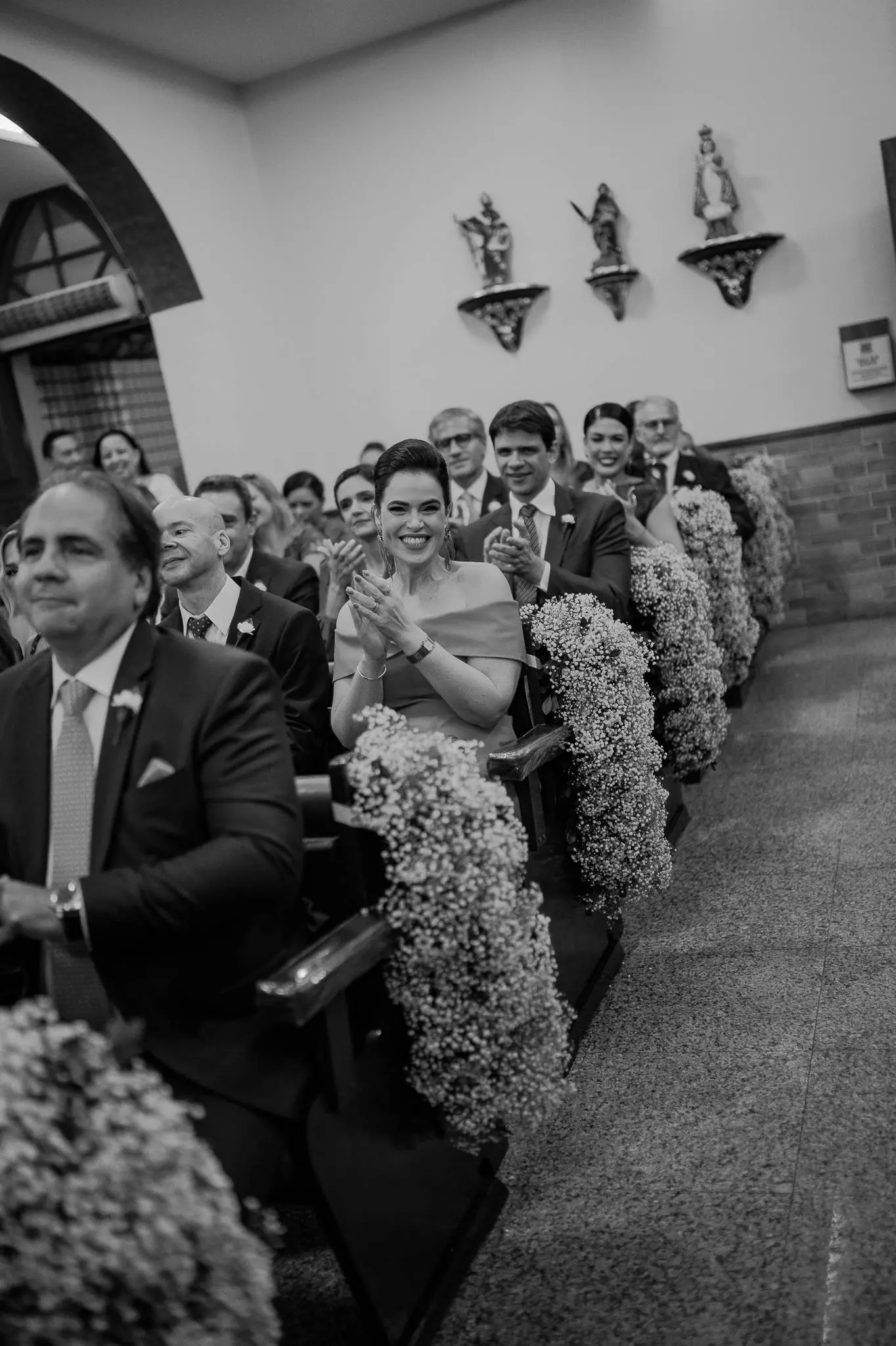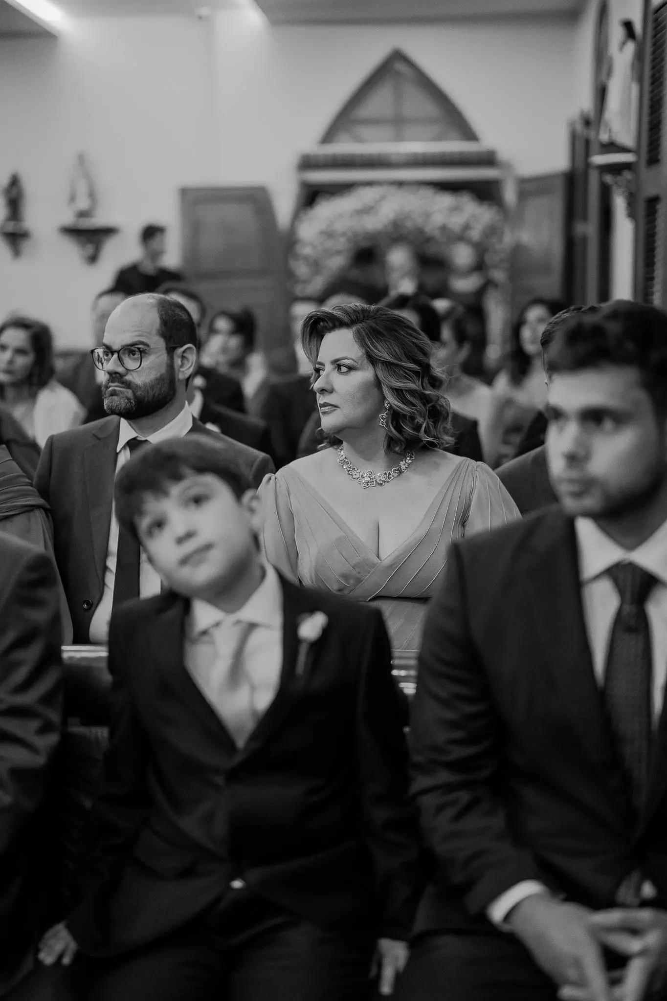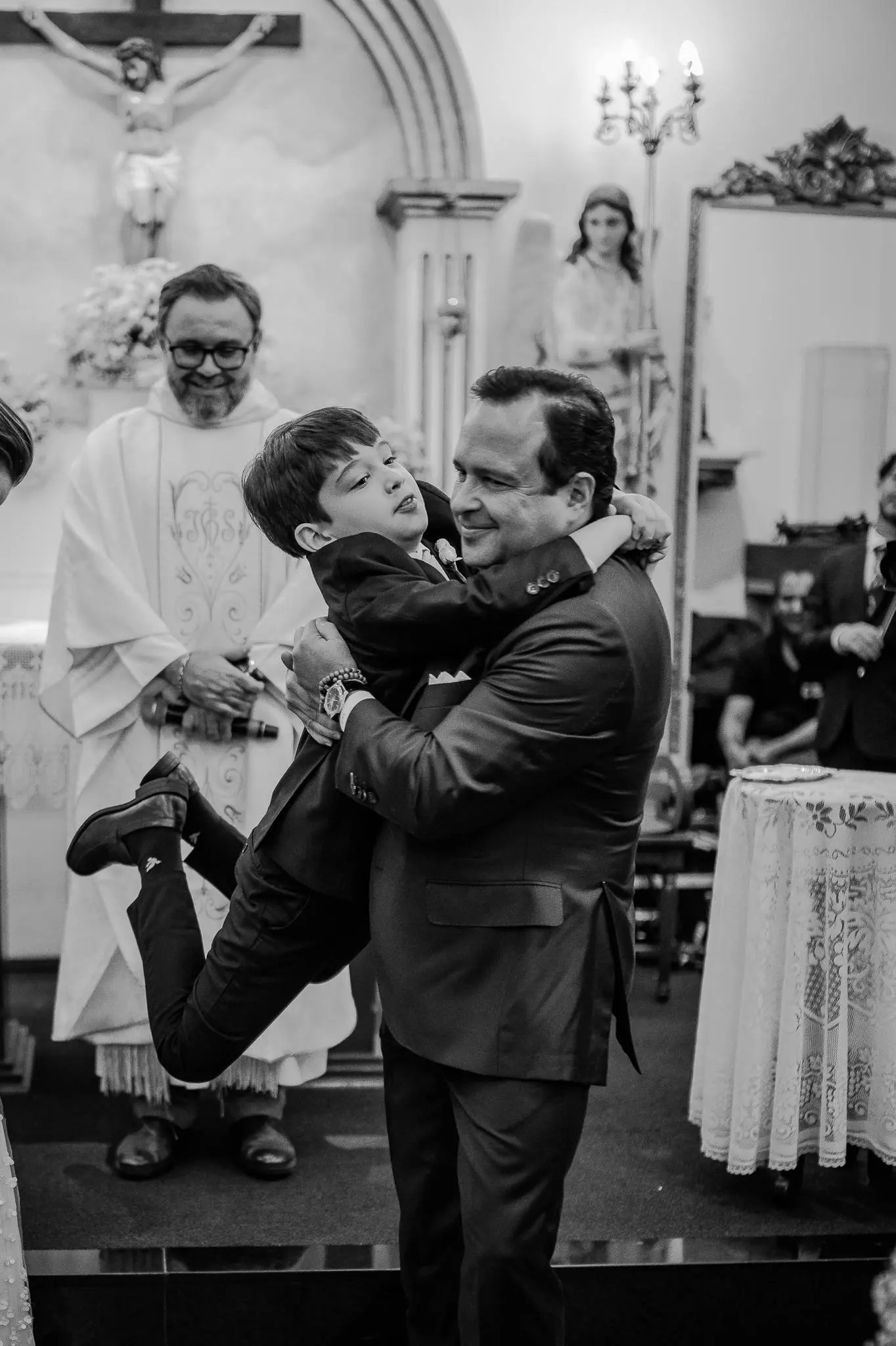 Aline entrou na igreja ao lado de seu pai, enquanto seu filho, Victor, levou as alianças. O momento foi ainda mais especial com a presença do Padre Duarte, amigo da família, que celebrou a cerimônia de forma carinhosa. Lucas Queiroz fez a primeira leitura. No final, o padre Duarte convidou Victor Queiroz Barroso para anunciar que os pais/noivos estavam casados! Foi lindo! Aline e Igor trocaram votos e se emocionaram durante toda a cerimônia.