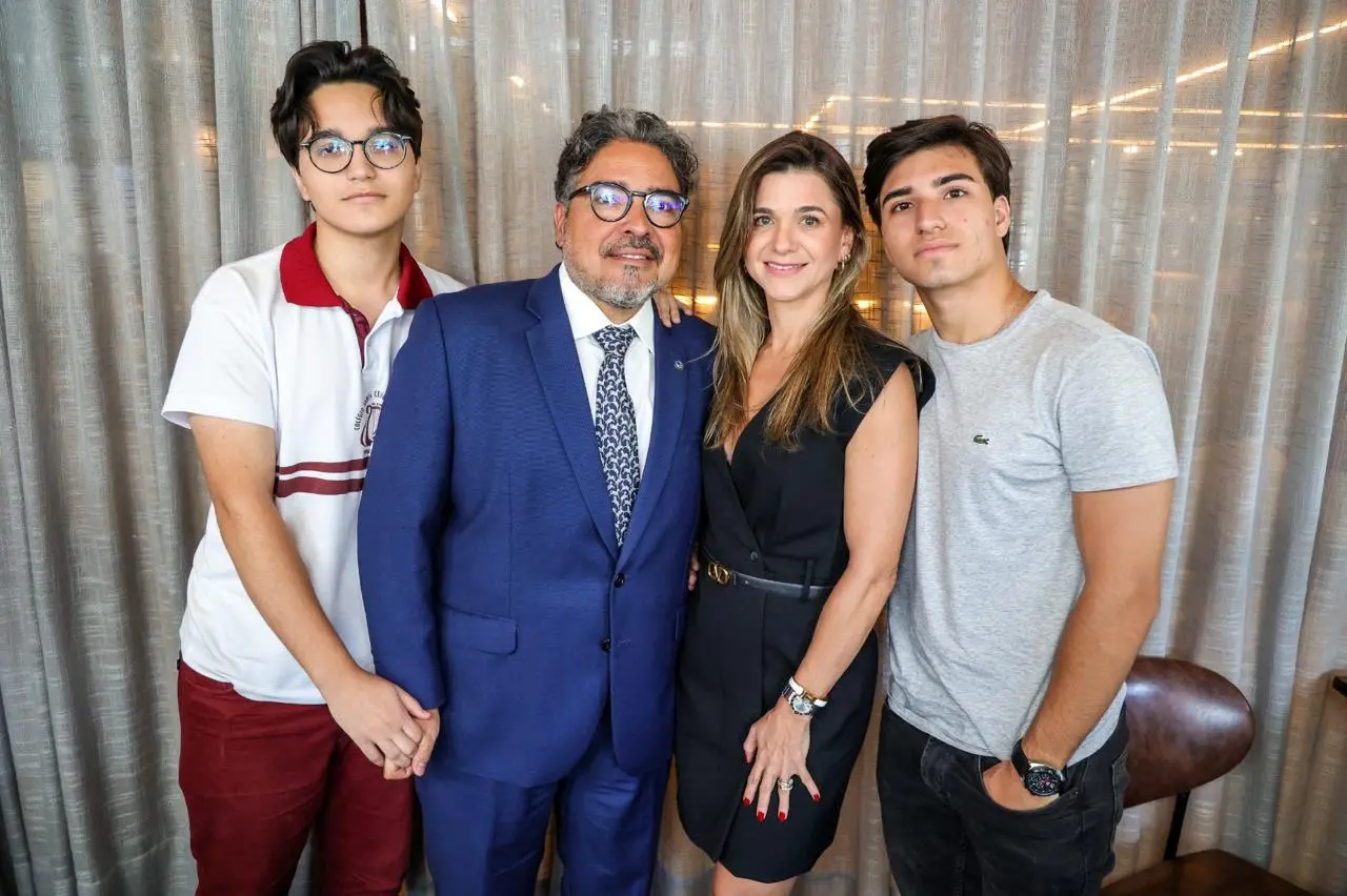 Recém-chegado do doutorado na Universidade do Porto, ele optou por um brinde restrito, registrado ao lado de Aline, Gabriel e Pedro — seu núcleo afetivo e inegociável.
