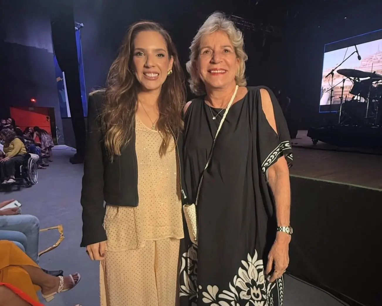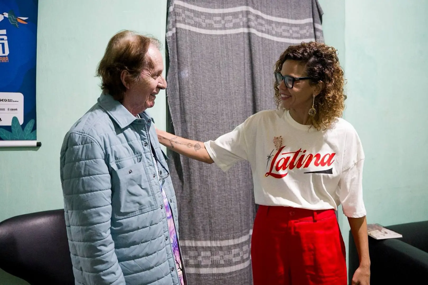 A secretária de Cultura Luisa Cela surgiu atenta, ao lado da ex-governadora Izolda Cela, ambas aplaudindo a homenagem e o show de Beto Guedes — emoção em tom maior e família por perto.