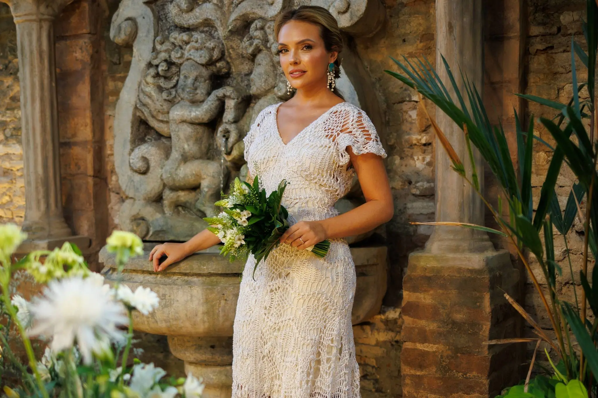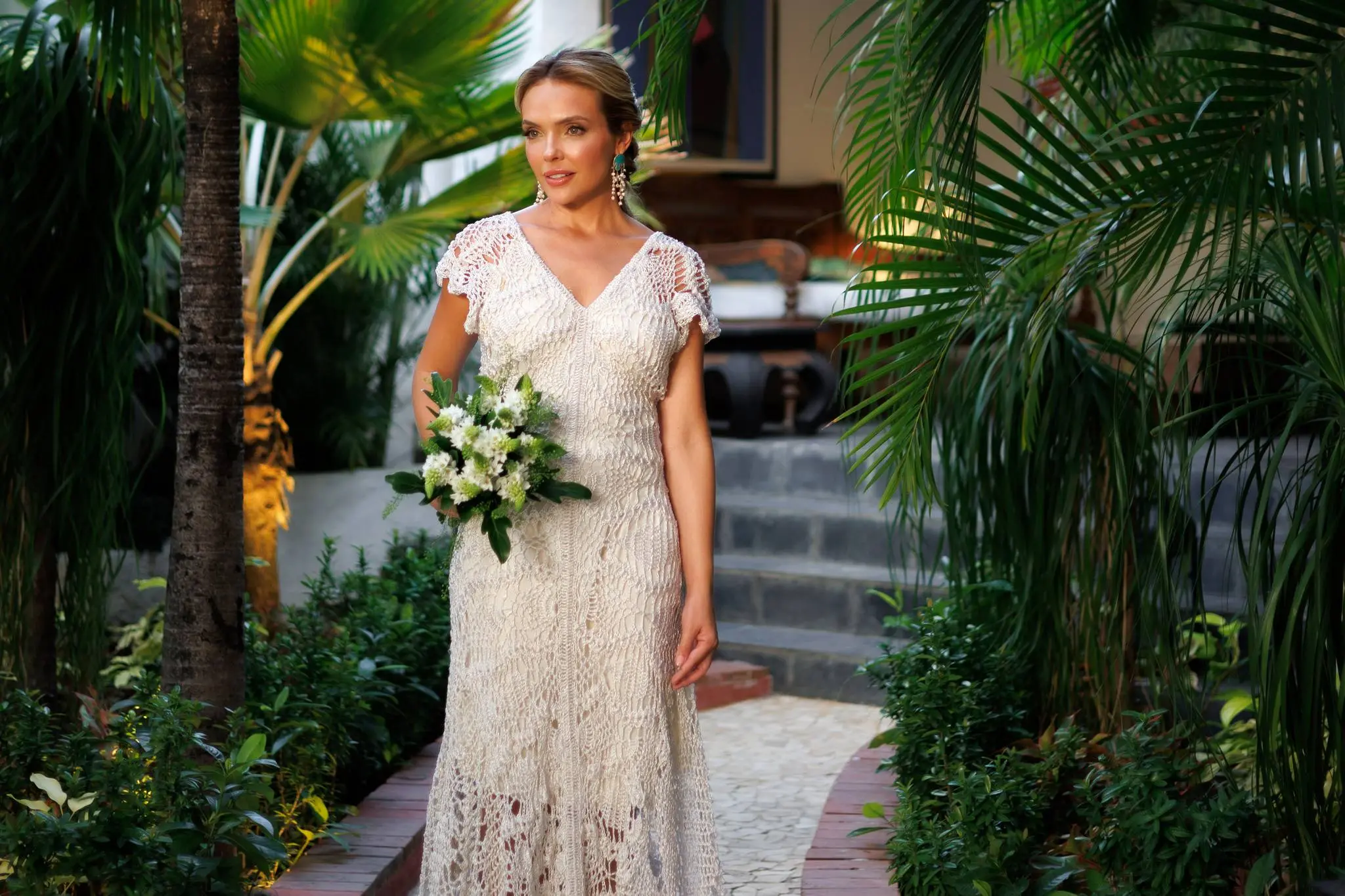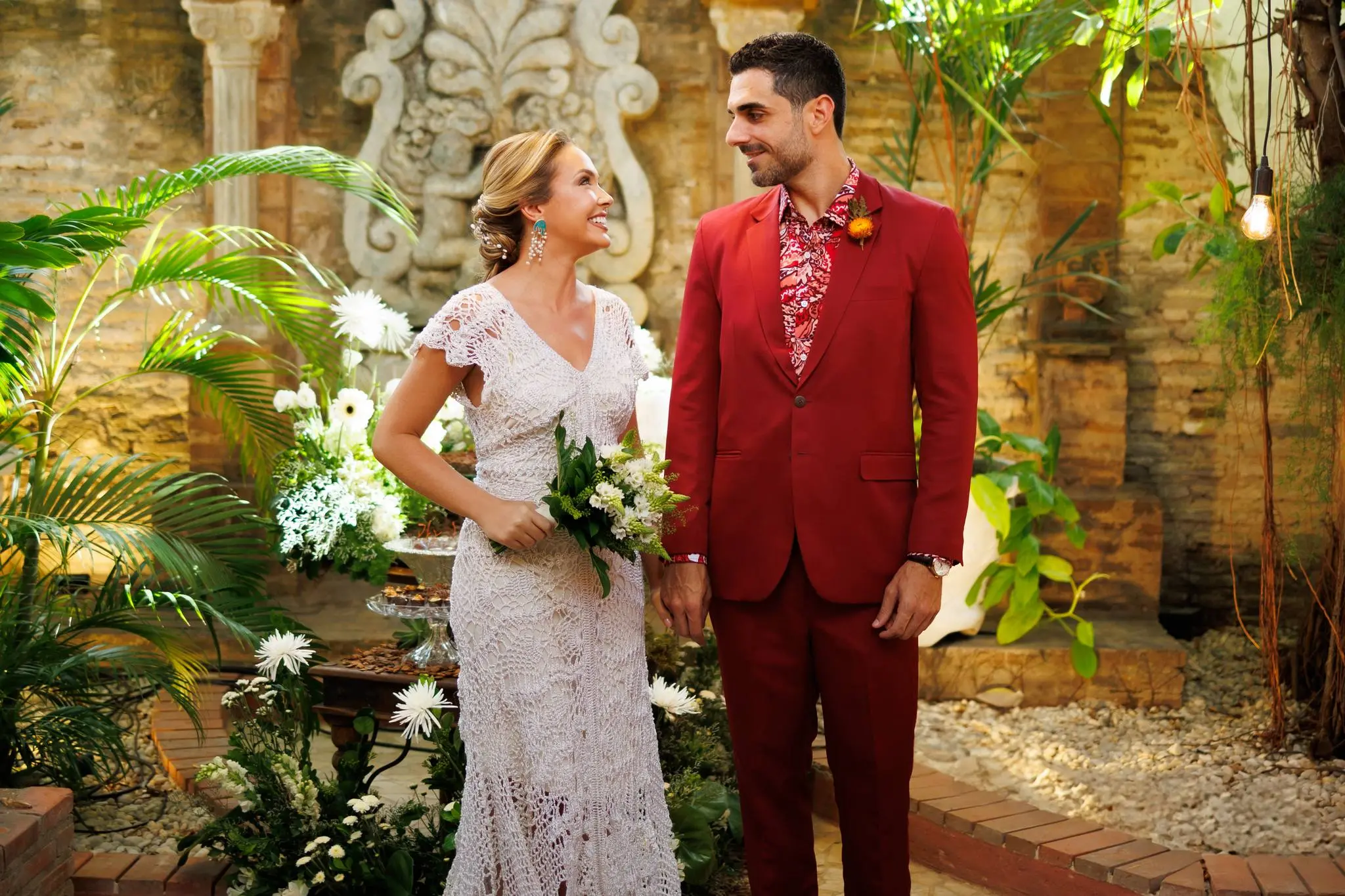 A noiva escolheu um modelo em crochet da estilista Jack, crocheteira que faz parte da Rede Graviola. A Rede Graviola é uma iniciativa que apoia mulheres artesãs da comunidade, trazendo à tona o talento e a criatividade dessas artesãs. O todo o styling foi de Cláudio Ferreira.