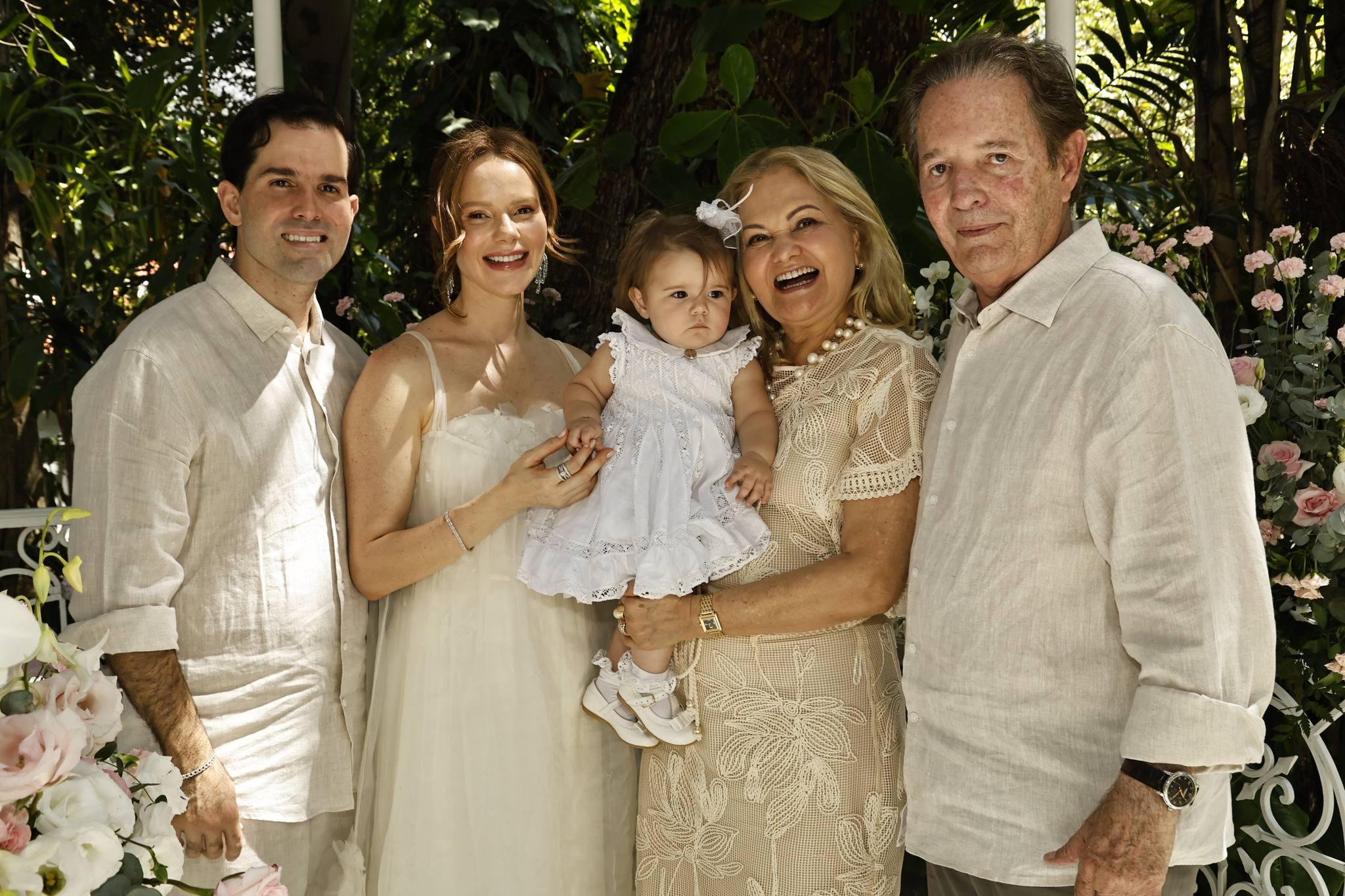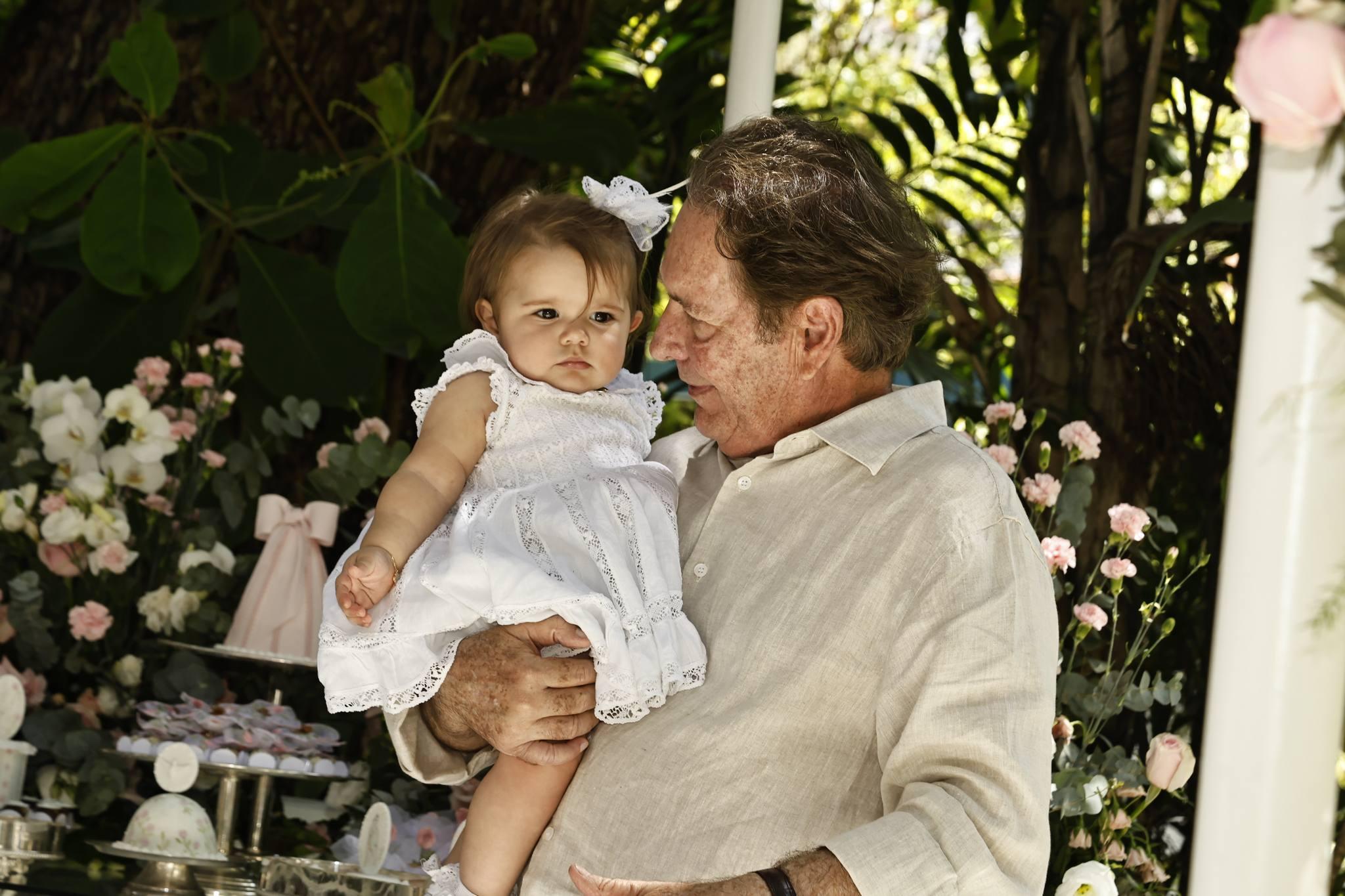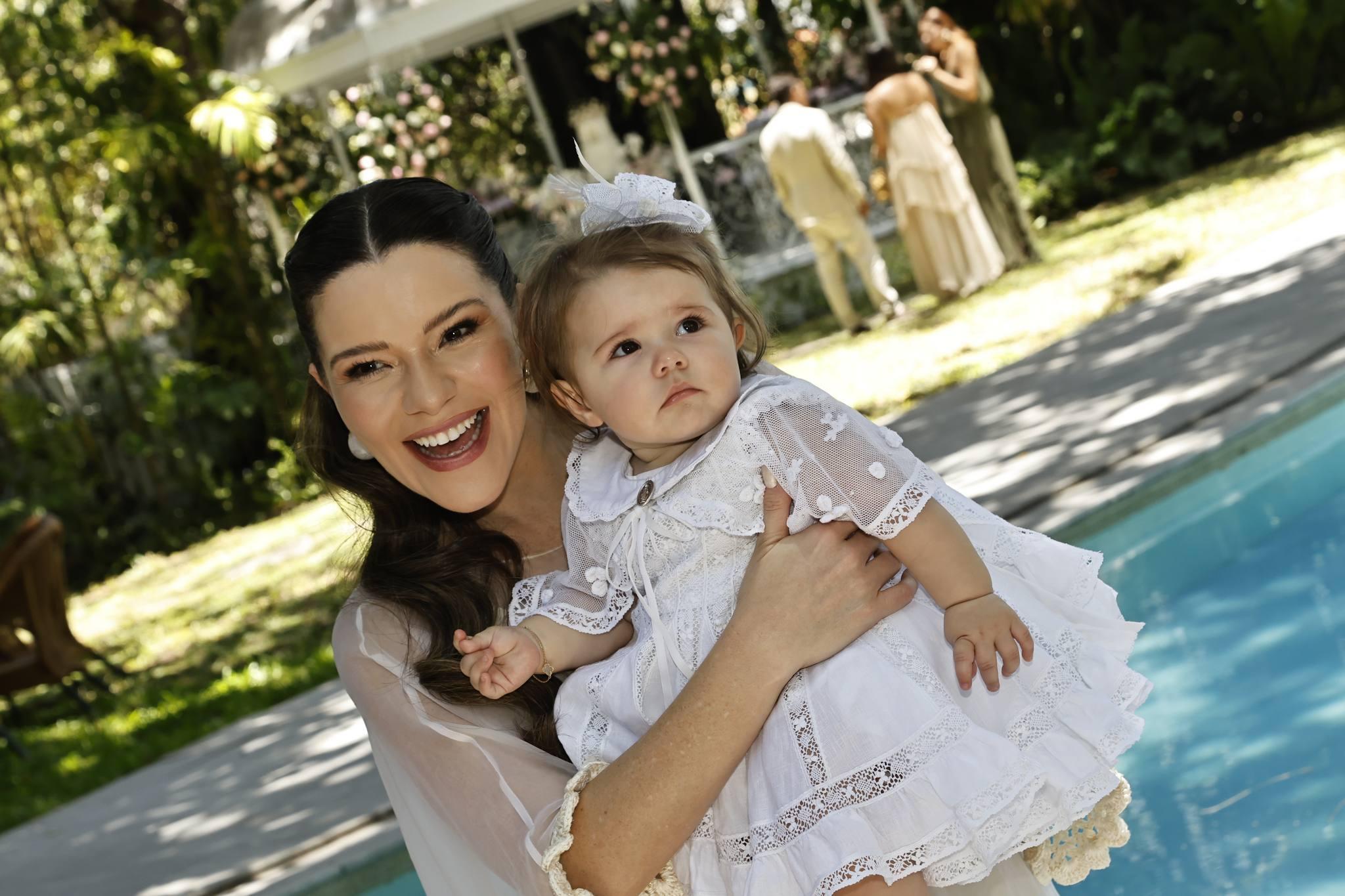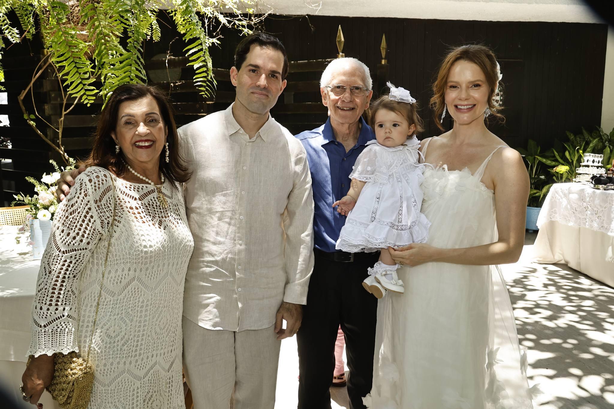 Nos jardins da residência de Dona Yolanda Queiroz, a manhã de sábado foi de pura emoção. Paulinha Sampaio Rocha e Felipe Queiroz Rocha celebraram o batizado da pequena Lourdes Maria, rodeados de familiares e amigos próximos.