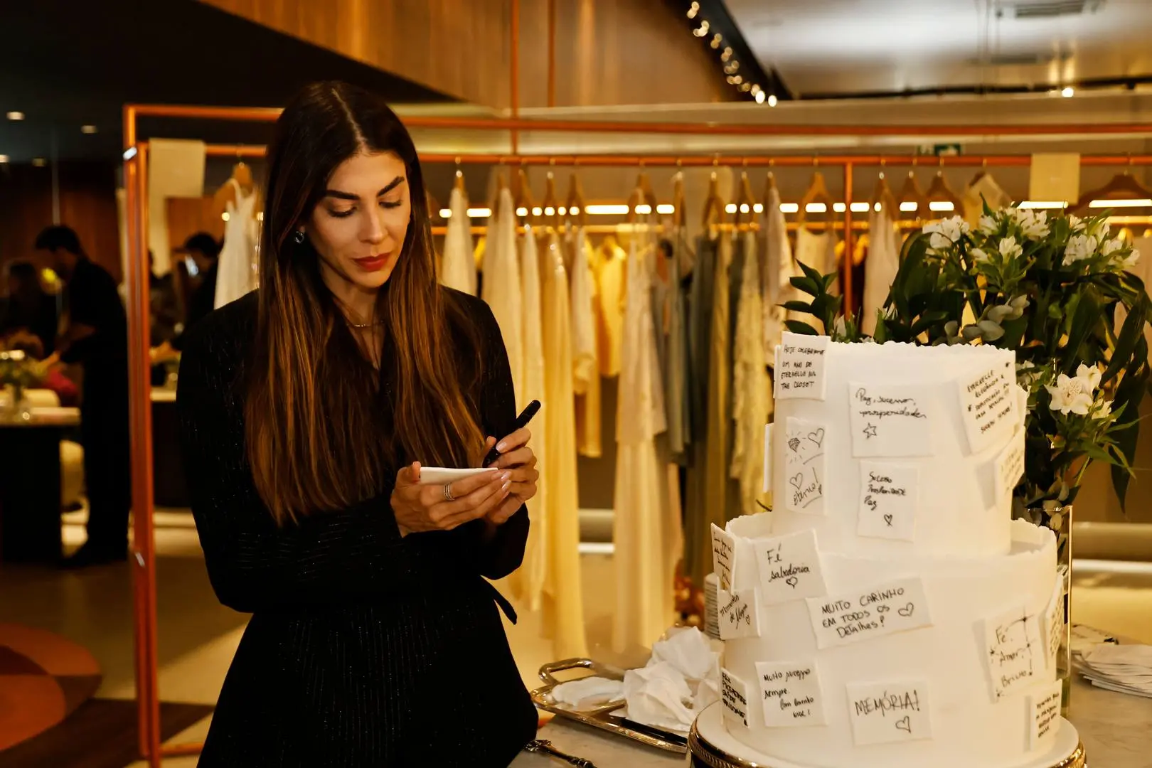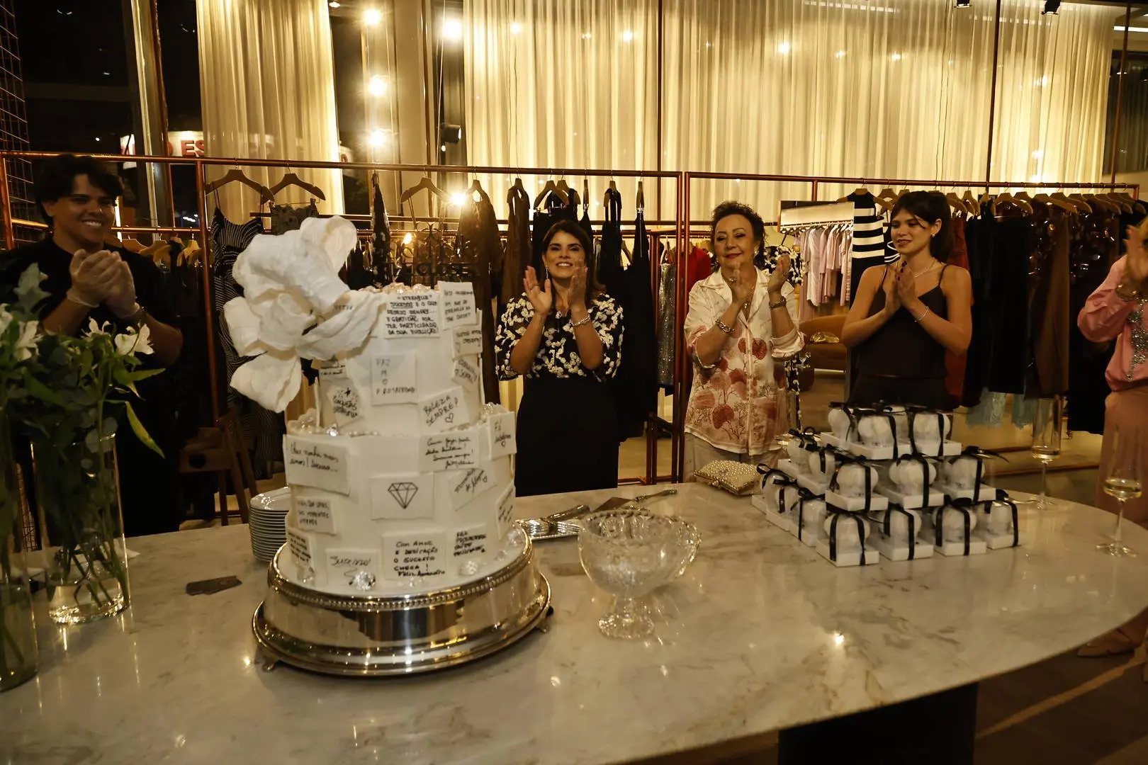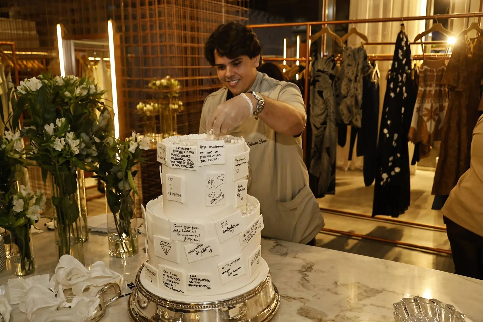 O ponto alto? O confeiteiro Cássio Sapore em performance ao vivo, com direito a bolo sendo finalizado a várias mãos — gesto simbólico, bem “alta roda afetiva”.