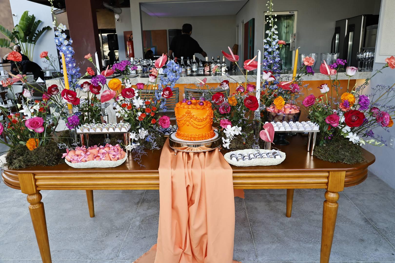A décor, assinada por Patrícia Aquino, trouxe um toque especial ao espaço, unindo elegância e alegria com muitas flores coloridas, um bolo da Analu Gourmet e delícias da Doce Mel.